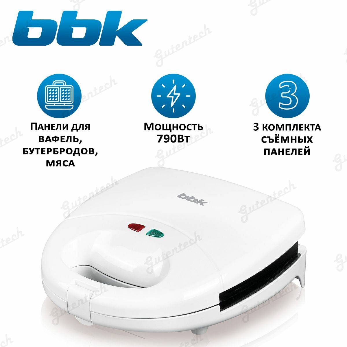 Сэндвичница "3 в 1" BBK ES028 белый, мощность 790 Вт, 3 съемные панели, антипригарное покрытие