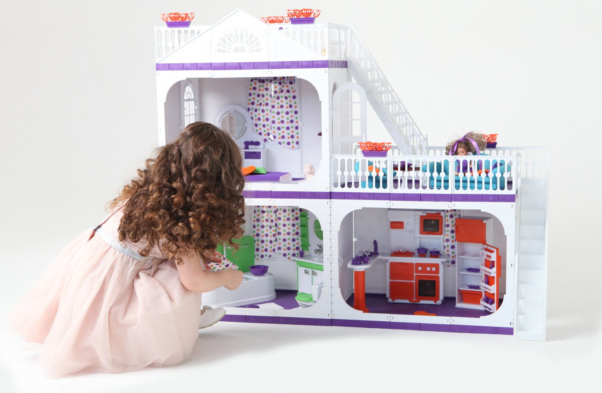 | Плюсы: | Не сложный в сборке. Прочный. Играет четырехлетняя дочь, но покушается громить двухлетний варвар. Выдерживает все атаки малолетнего вандала) Глубокий. В комнате можно разместить много мебели и кучу кукол. В бело/сиреневом исполнении довольно светлый. В смысле, в глубине комнаты не темно. Комбинируется и "достраивается" |