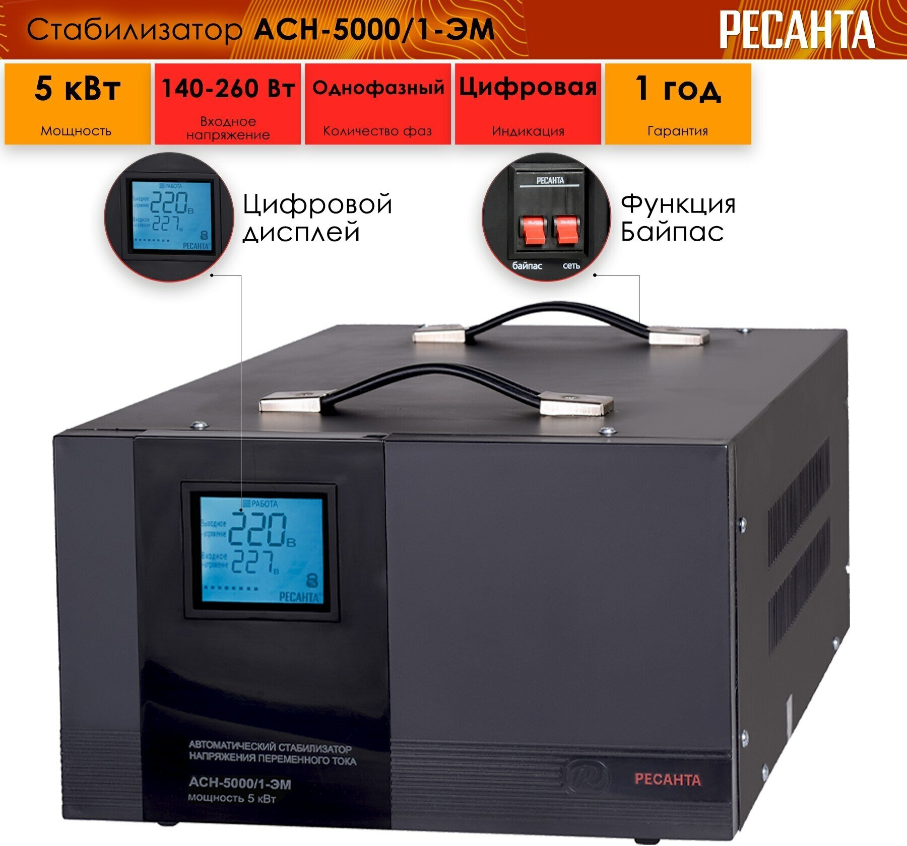 Стабилизатор напряжения однофазный РЕСАНТА АСН-5000/1-ЭМ, 5 кВт, 140-260В