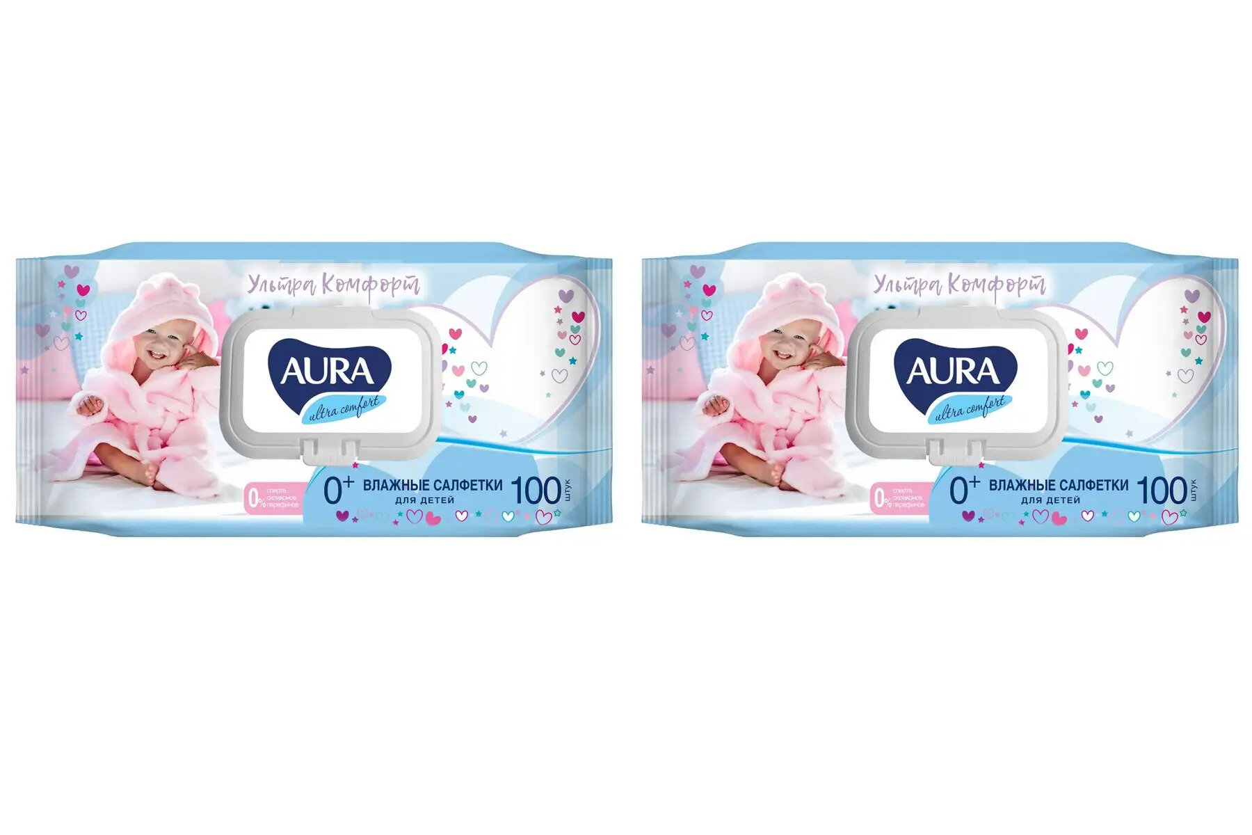 Влажные салфетки Aura Ultra Comfort 0+, 100 шт, 2 упаковки.