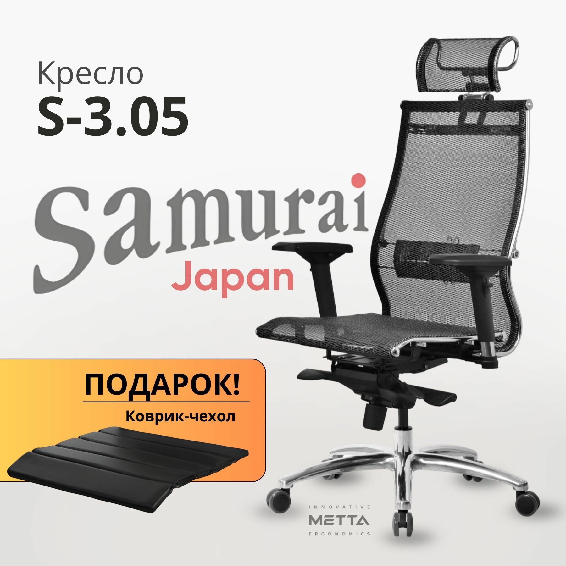 Кресло офисное метта «SAMURAI» S-3, с подголовником, сверхпрочная ткань-сетка, черное