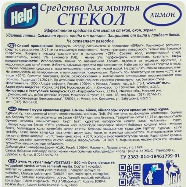Альфатехформ Моющее средство для стекол Help Лимон 750 мл