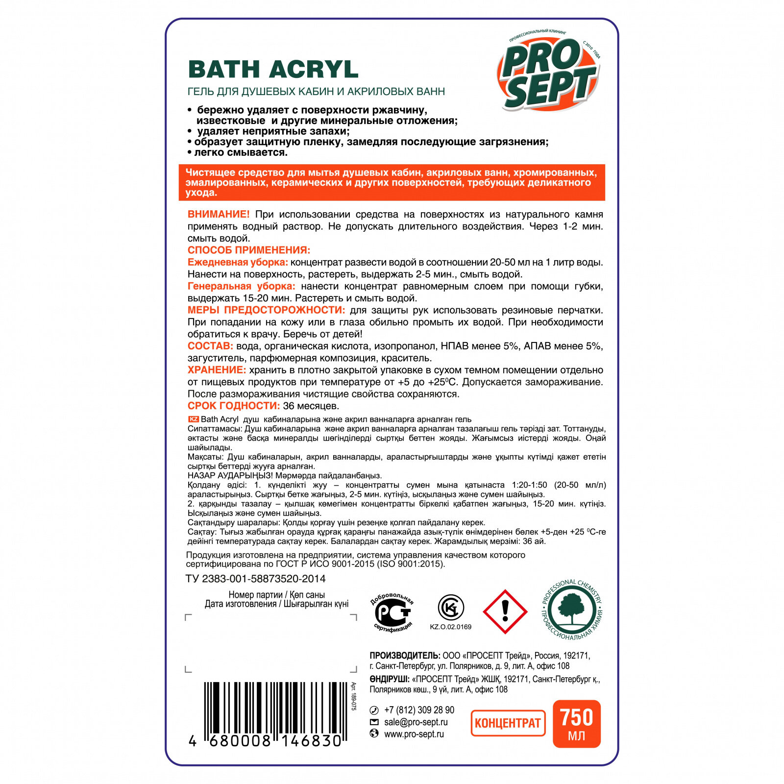 PROSEPT гель для чистки акриловых ванн и душевых кабин Bath Acryl, 0.75 л