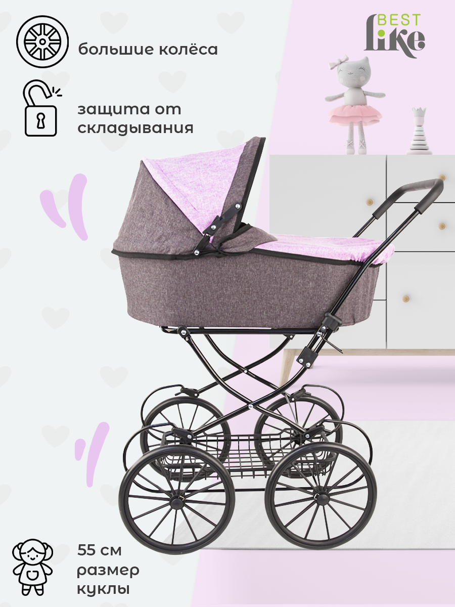 Коляска-люлька для кукол цикламеновый меланж с серой отделко
