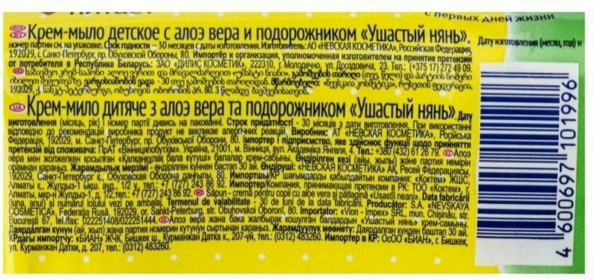 | Отзыв: | Крем-мыло детское с алоэ вера и подорожником под торговой маркой «Ушастый нянь» произведено ОАО «Невская Косметика» в России. Образец был приобретен в ЗАО «Торговый дом “Перекресток”» (гипермаркет «Карусель») по адресу: г. Москва, пр-т Андропова, д. 8а.
