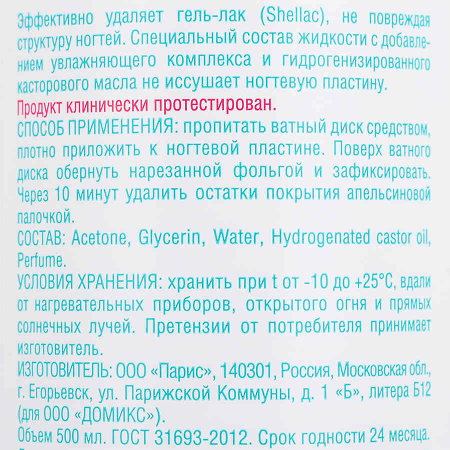 Увлажняющий комплекс Гидрогенизированное касторовое масло не сушит кожу Хорошее средство. Пахнет не сильно. Снимает гель-лак через 10-15 минут. |
