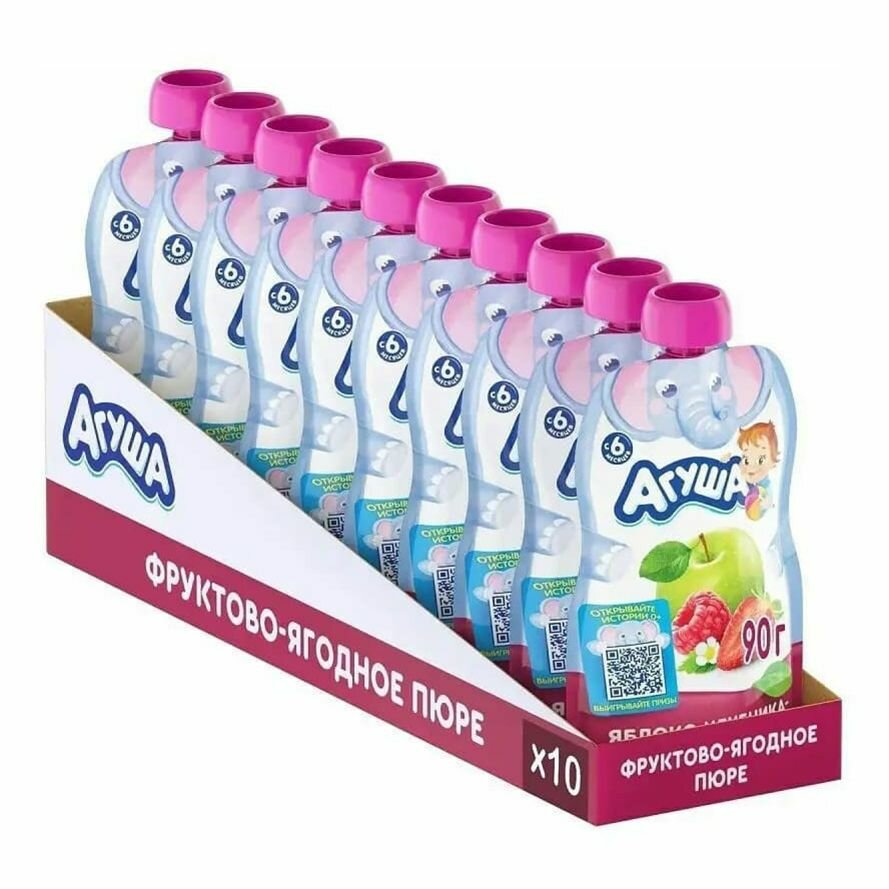 Агуша Пюре Фруктовое Яблоко-клубника-малина 90г Паучи 10 шт