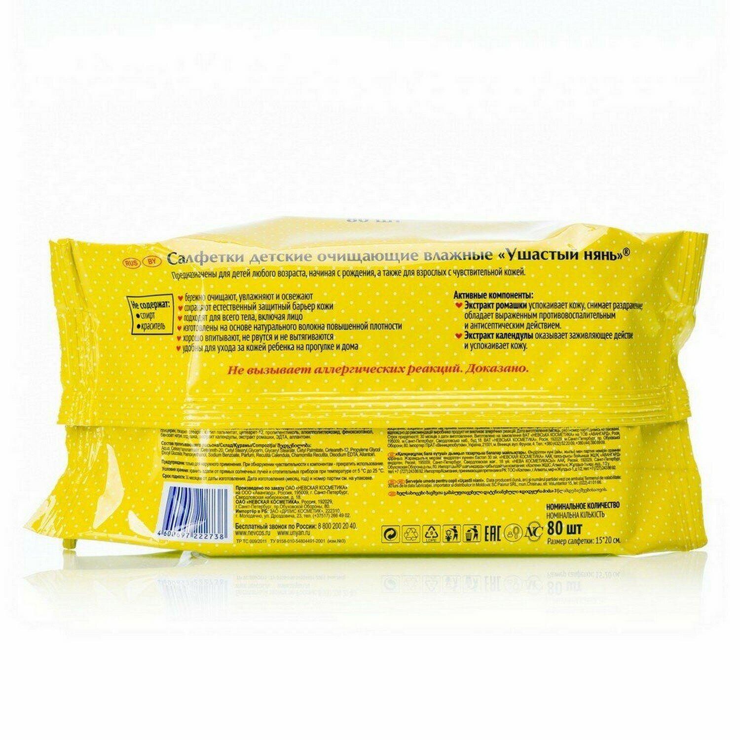 Салфетки влажные, комплект 80 шт., ушастый нянь, гипоаллергенные, 22273