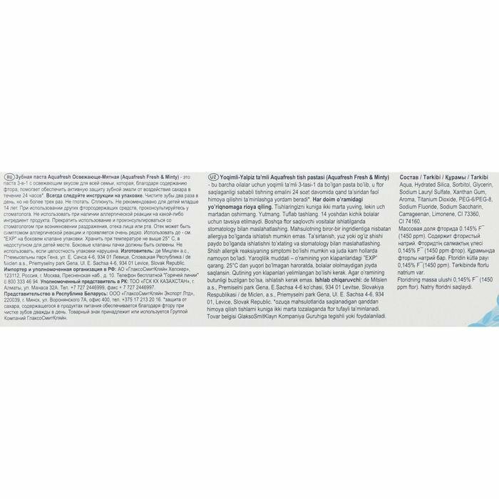 Зубная паста Aquafresh Освежающе-мятная с фтором для тройной защиты полости рта: защита от кариеса, укрепление зубов и свежесть дыхания, 100 мл 3 шт