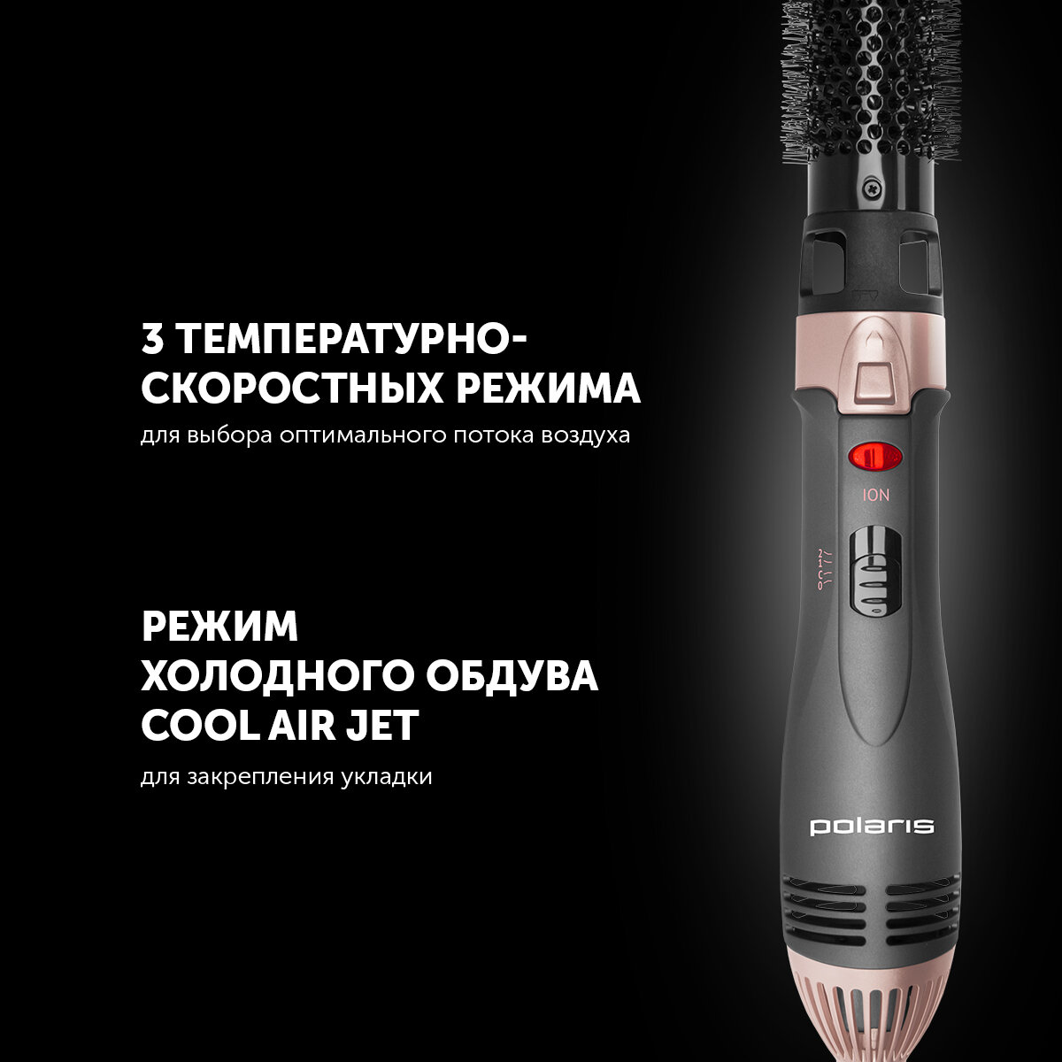Фен-щётка Polaris PHS1204i 4 насадки:концентратор,полукруглая,круглая 25 и 35мм