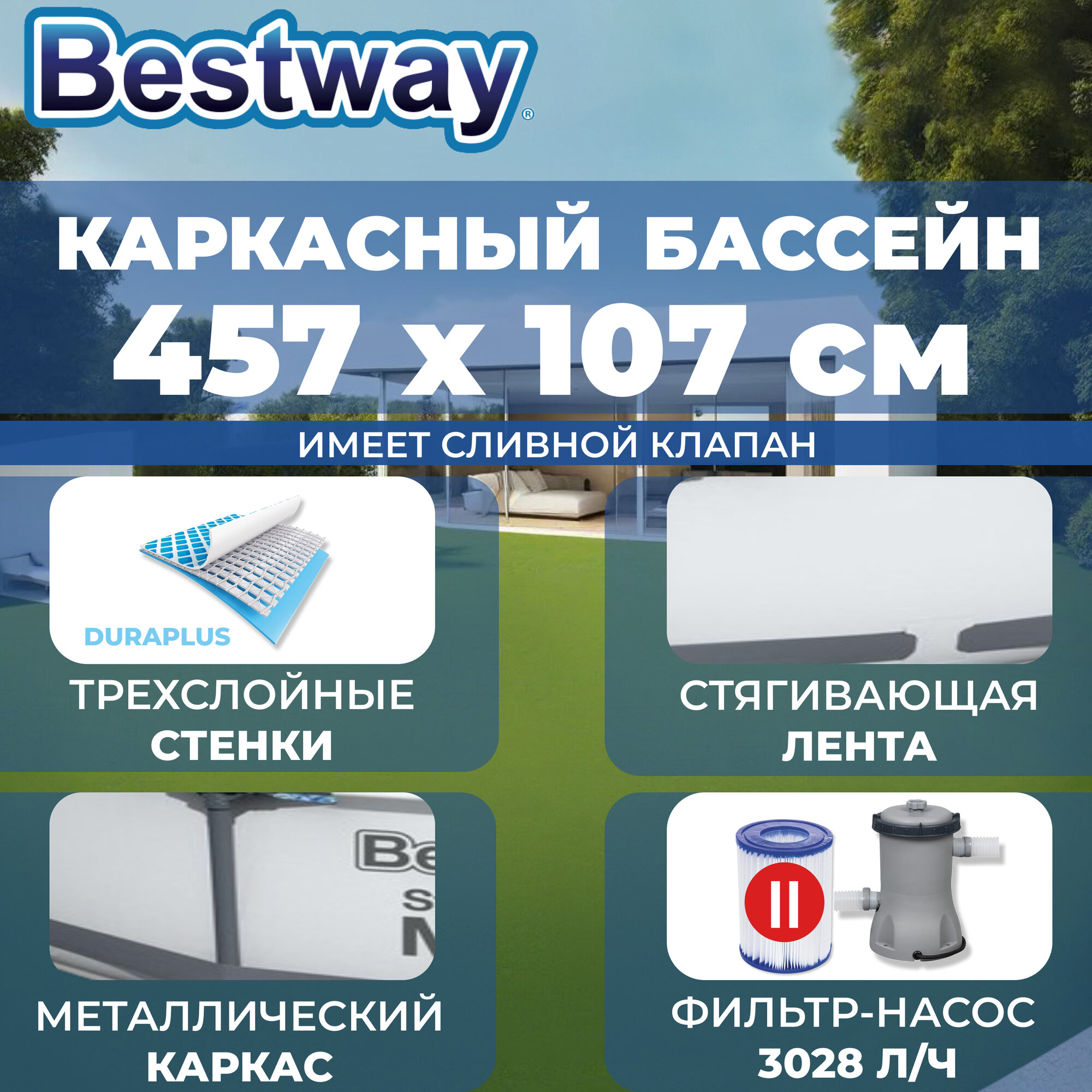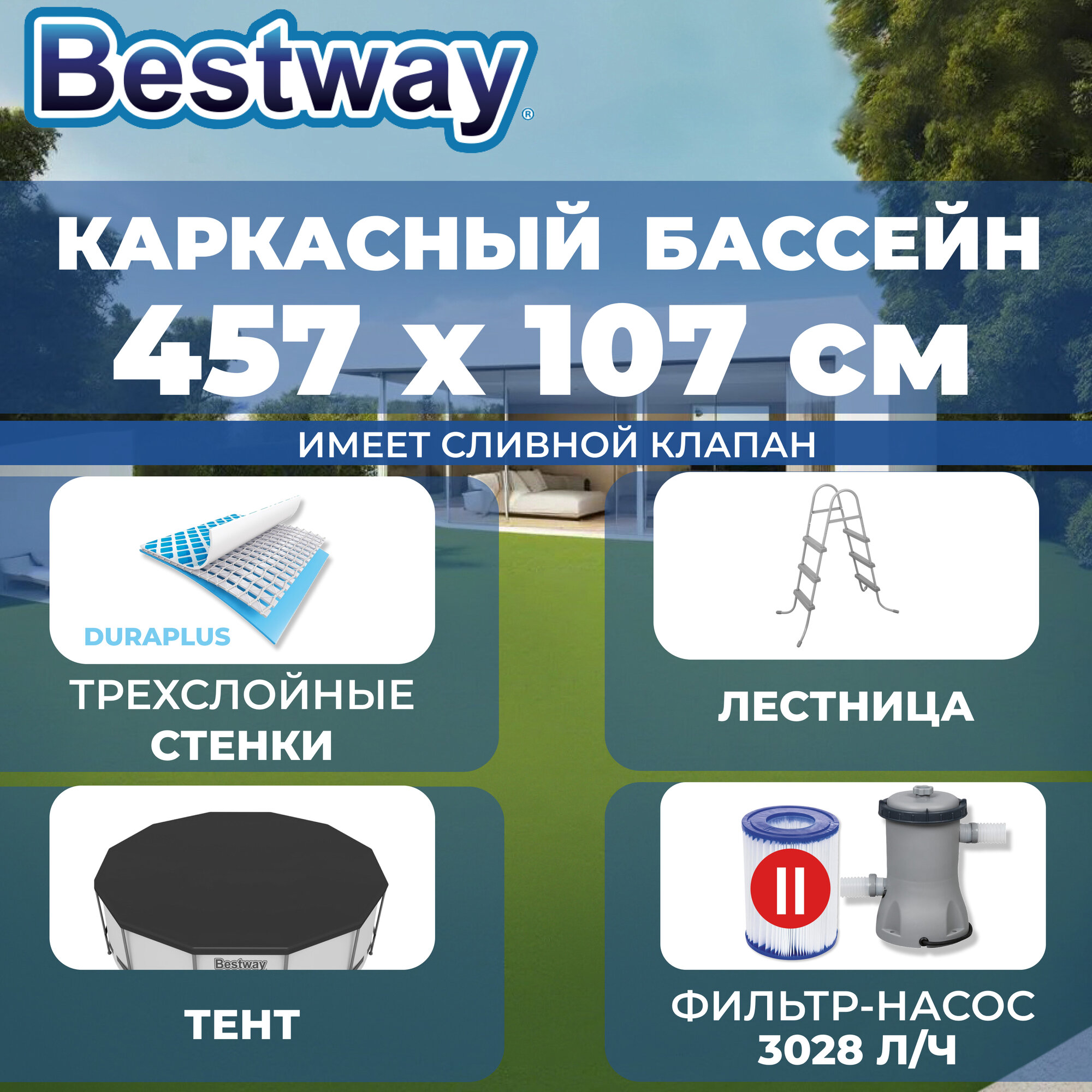 Ниже Вы можете прочитать отзывы на Бассейн каркасный Bestway "Steel Pro MAX", 457х107 см, фильтр-насос, лестница, тент, ознакомится с подробными характеристиками, посмотреть интересные обзоры и фотографии на Бассейн каркасный Bestway "Steel Pro MAX", 457х107 см, фильтр-насос, лестница, тент.