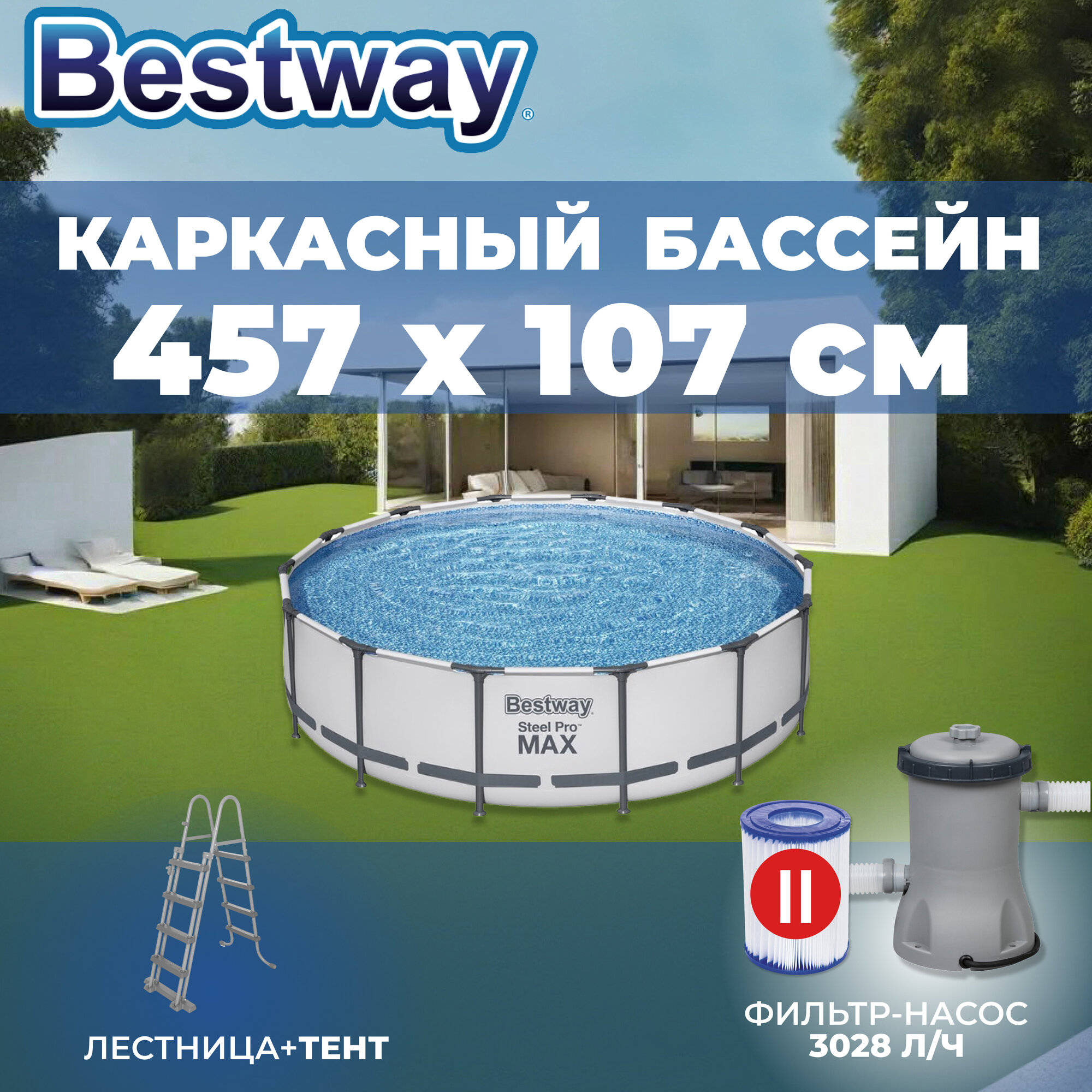 Купить Бассейн каркасный Bestway "Steel Pro MAX", 457х107 см, фильтр-насос, лестница, тент