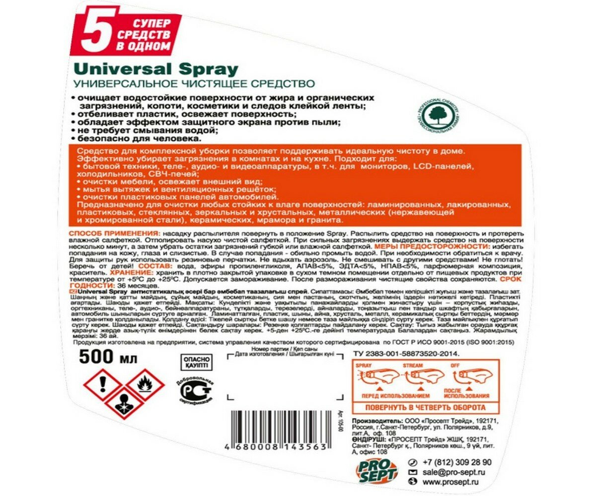 Универсальное моющее и чистящее средство Universal Spray, готовое к применению, 5 л PROSEPT 1284631 .