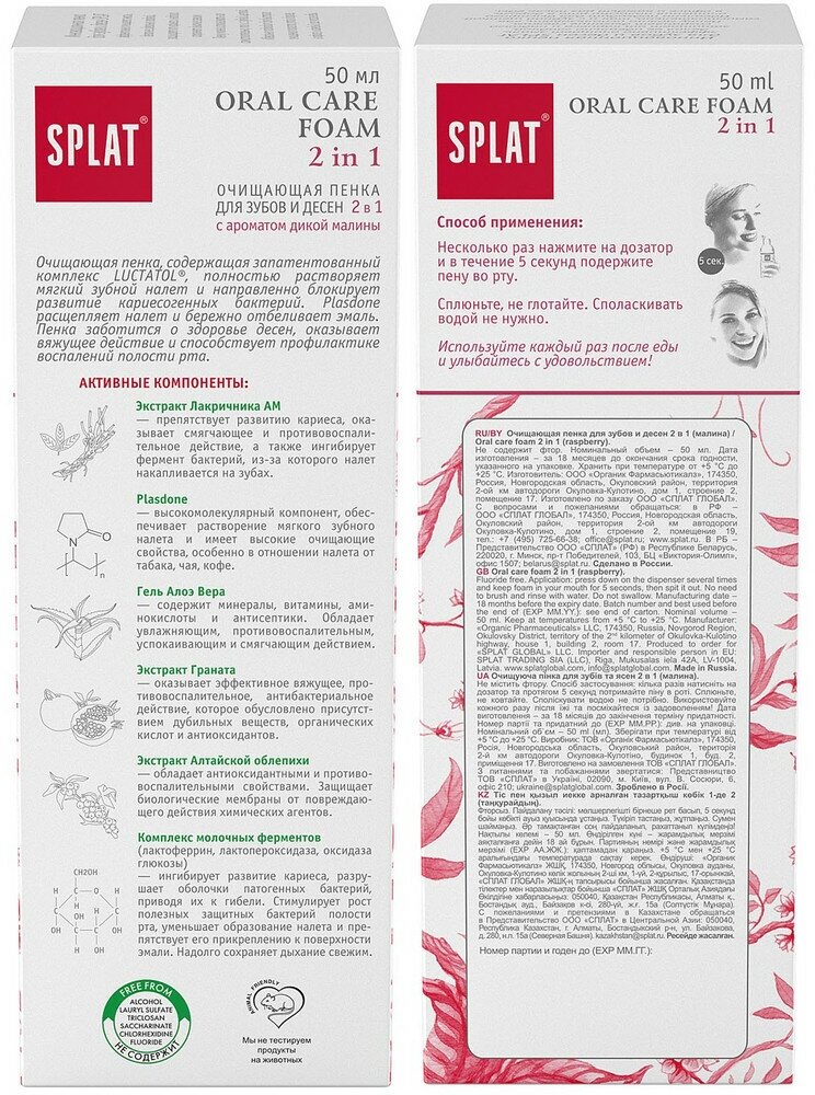Очищающая пенка Splat Oral Care Foam для зубов и десен, 2в1, с ароматом малины, 50 мл