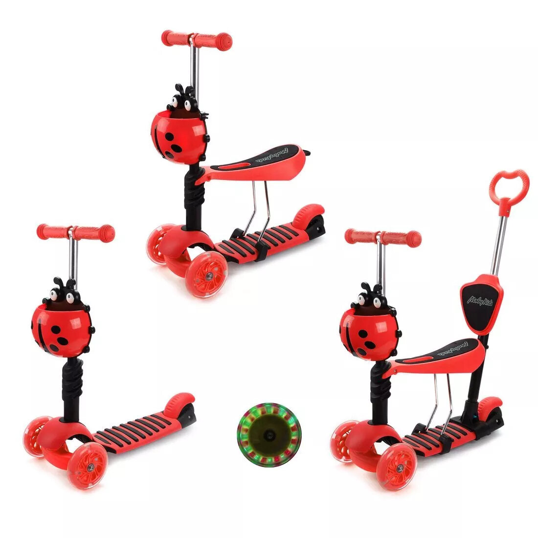 Самокат MobyKids Божья коровка 3 в 1, свет. кол., красный