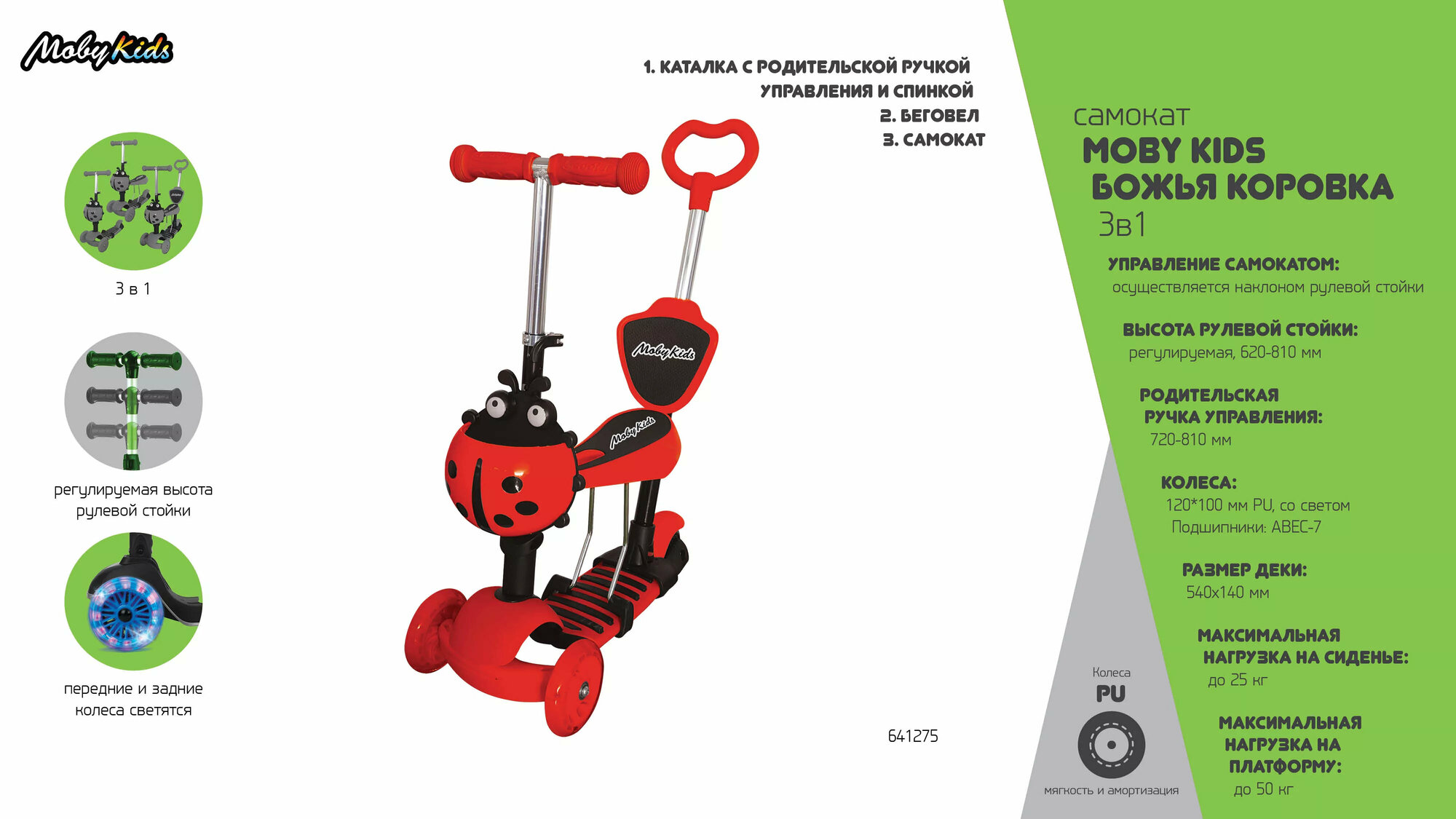 Самокат для малышей "Moby Kids Божья Коровка" 3в1 (зеленый) (с ручкой, светящиеся колеса)