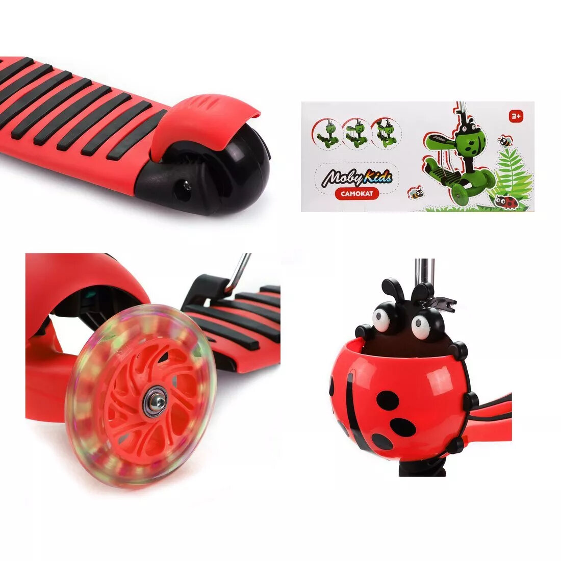 Самокат Moby Kids Божья коровка 3в1, свет. кол., красный