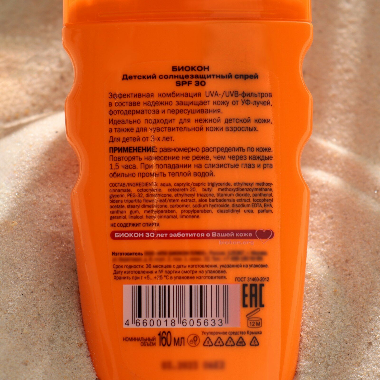 Детский спрей для безопасного загара биокон SPF 30 водостойкий, 160 мл
