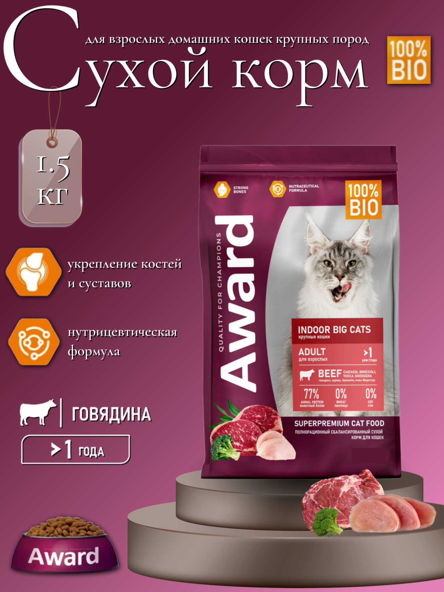 Купить Сухой корм AWARD Indoor Big cats для взрослых домашних кошек крупных пород с говядиной и курицей с добавлением брокколи и юкки Шидигера 1,5кг
