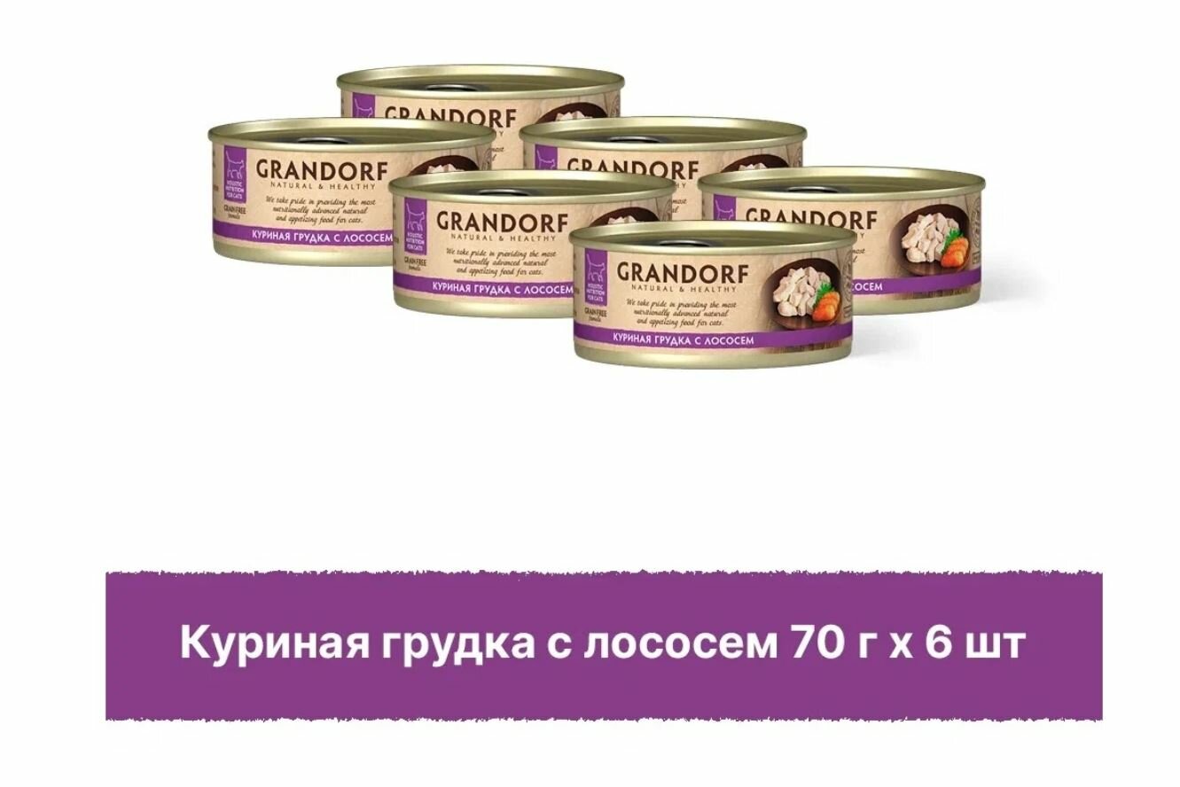 GRANDORF CAT для взрослых кошек с куриной грудкой и лососем (70 гр х 6 шт)