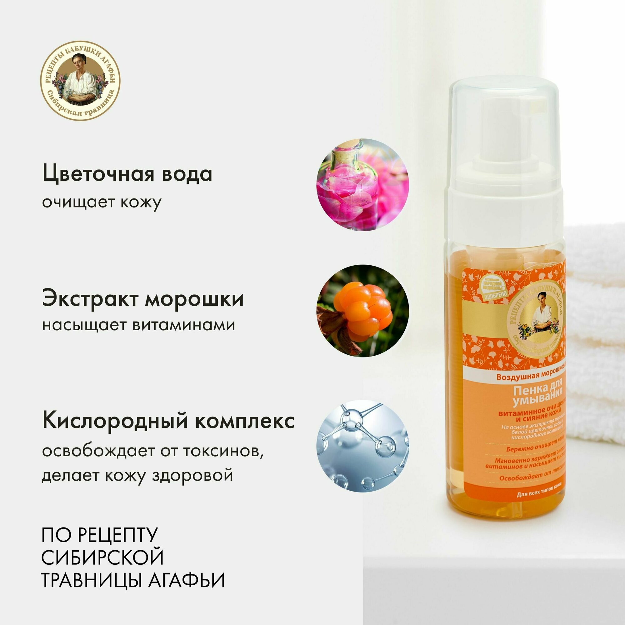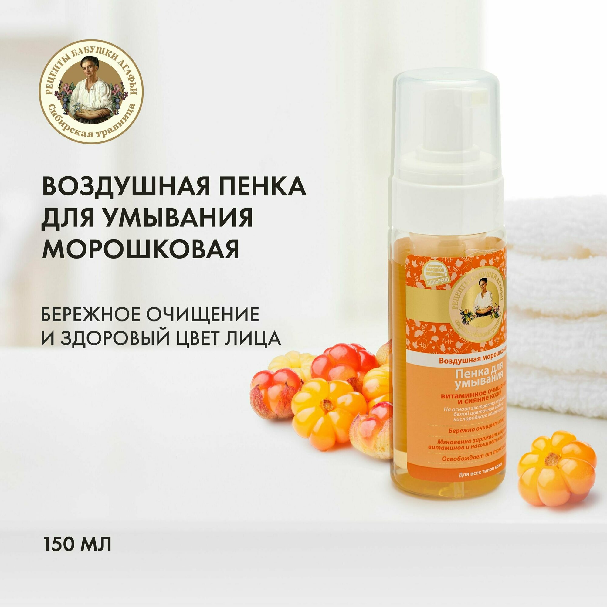 Рецепты бабушки Агафьи пенка для умывания воздушная морошковая, 150 мл