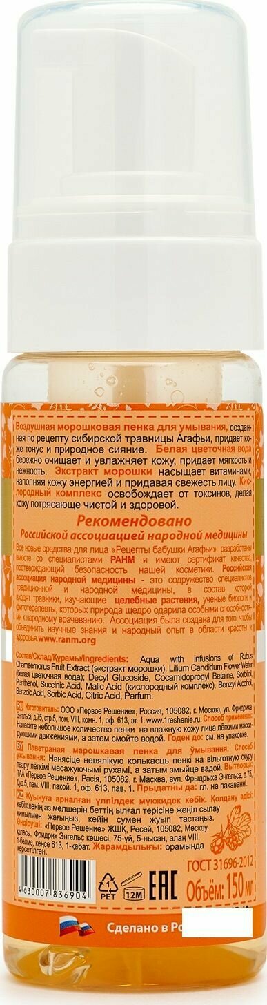 Рецепты бабушки Агафьи пенка для умывания воздушная морошковая, 150 мл