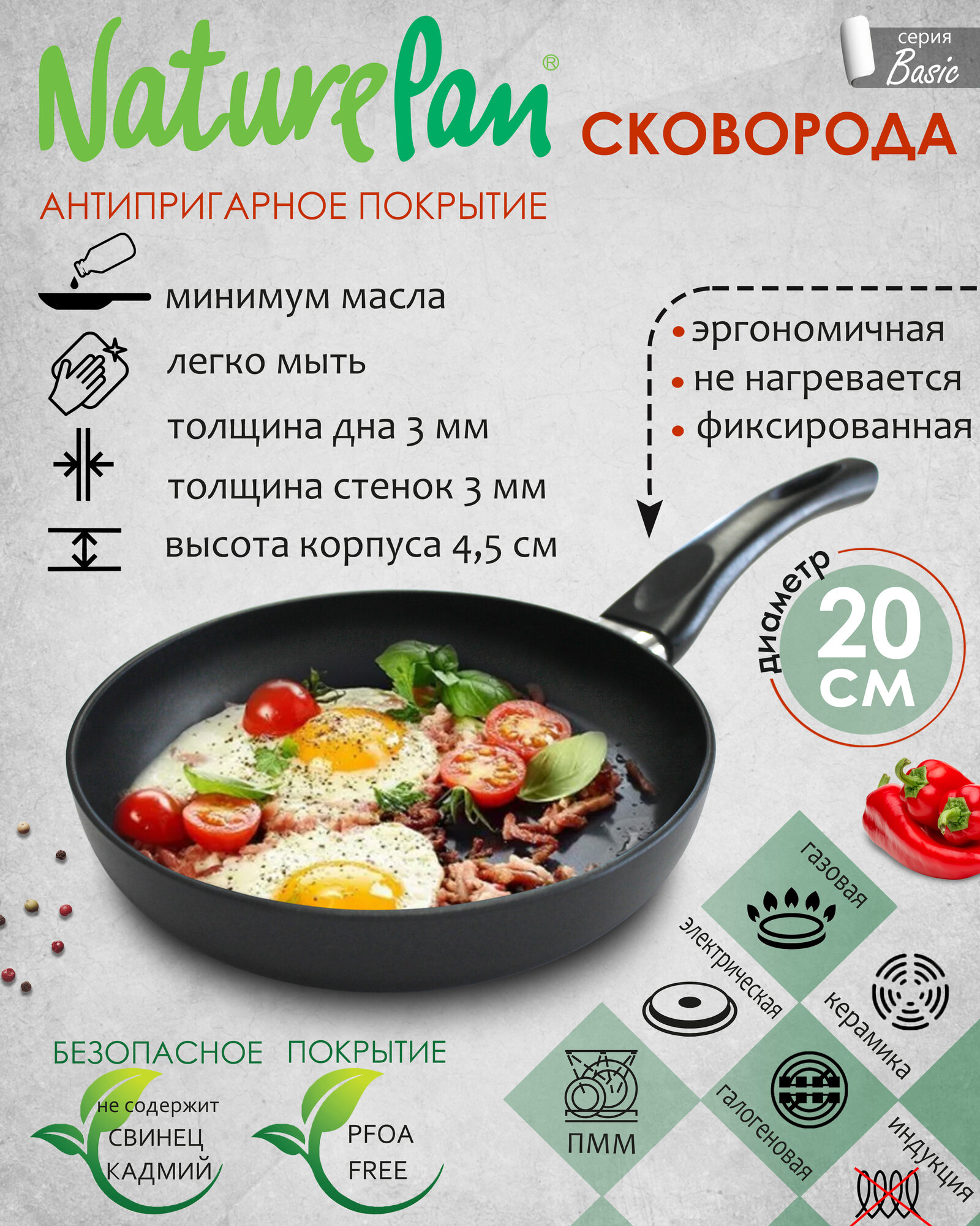 Сковорода с антипригарным покрытием, NaturePan Basic d20см, h4,5см интересное: