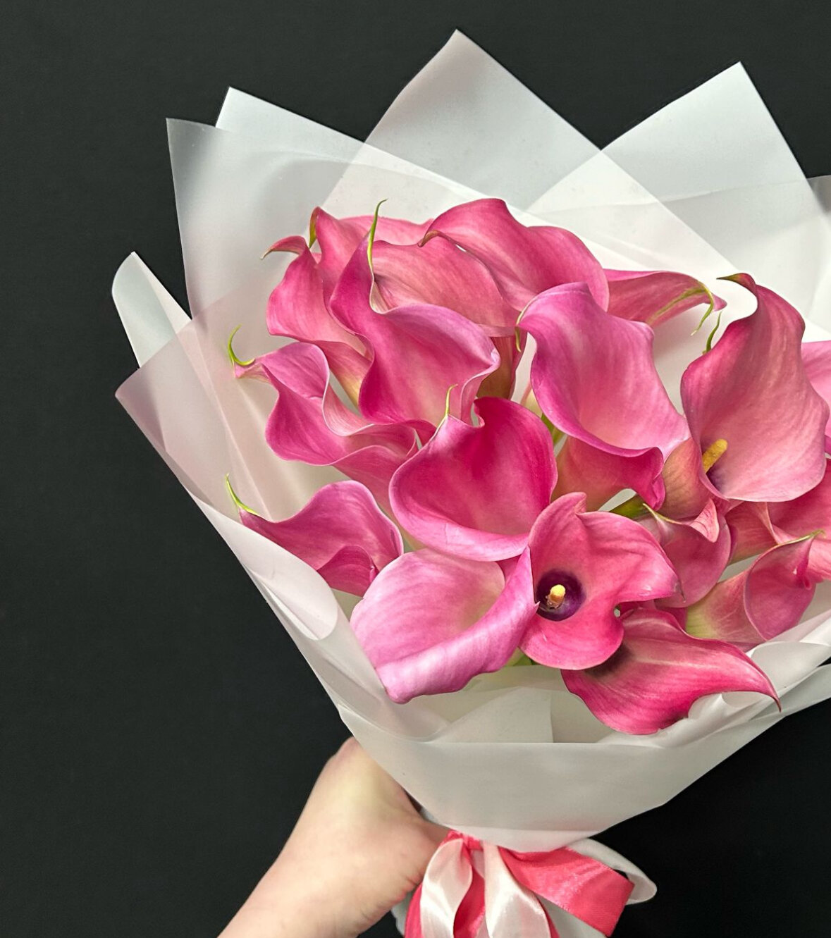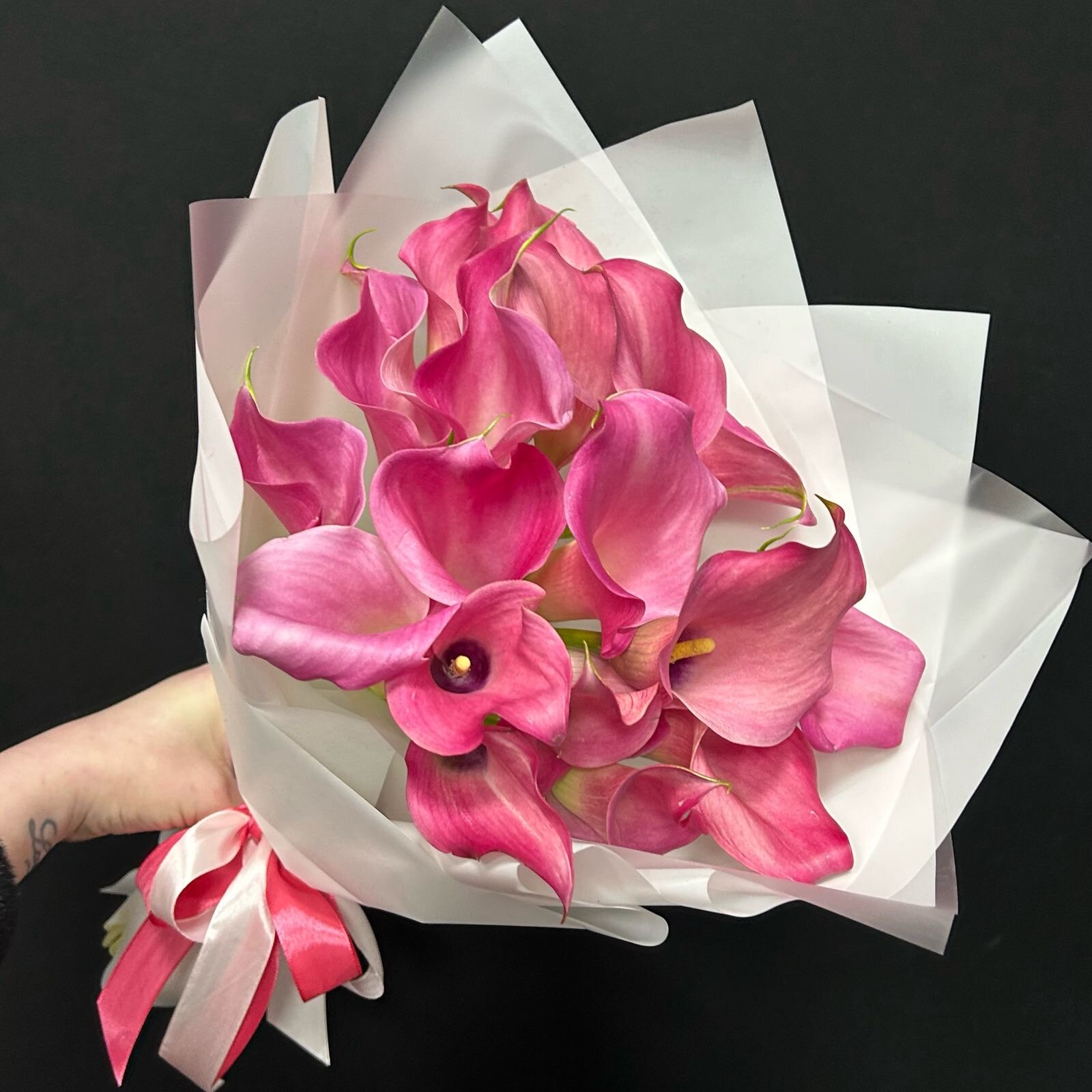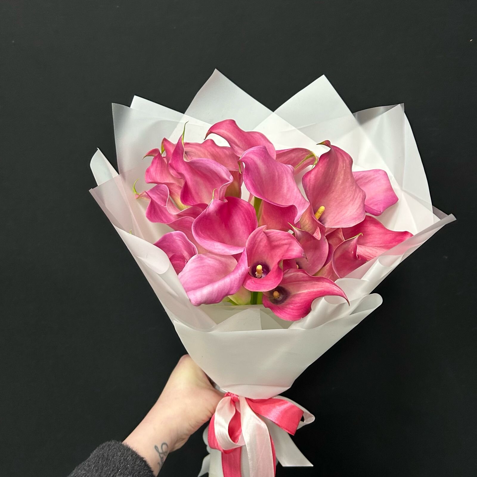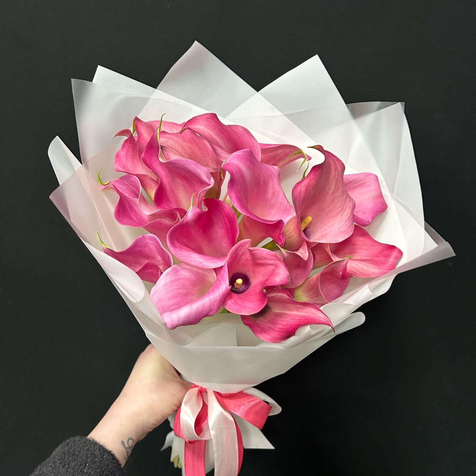 Букет из 19 розовых калл интересное: