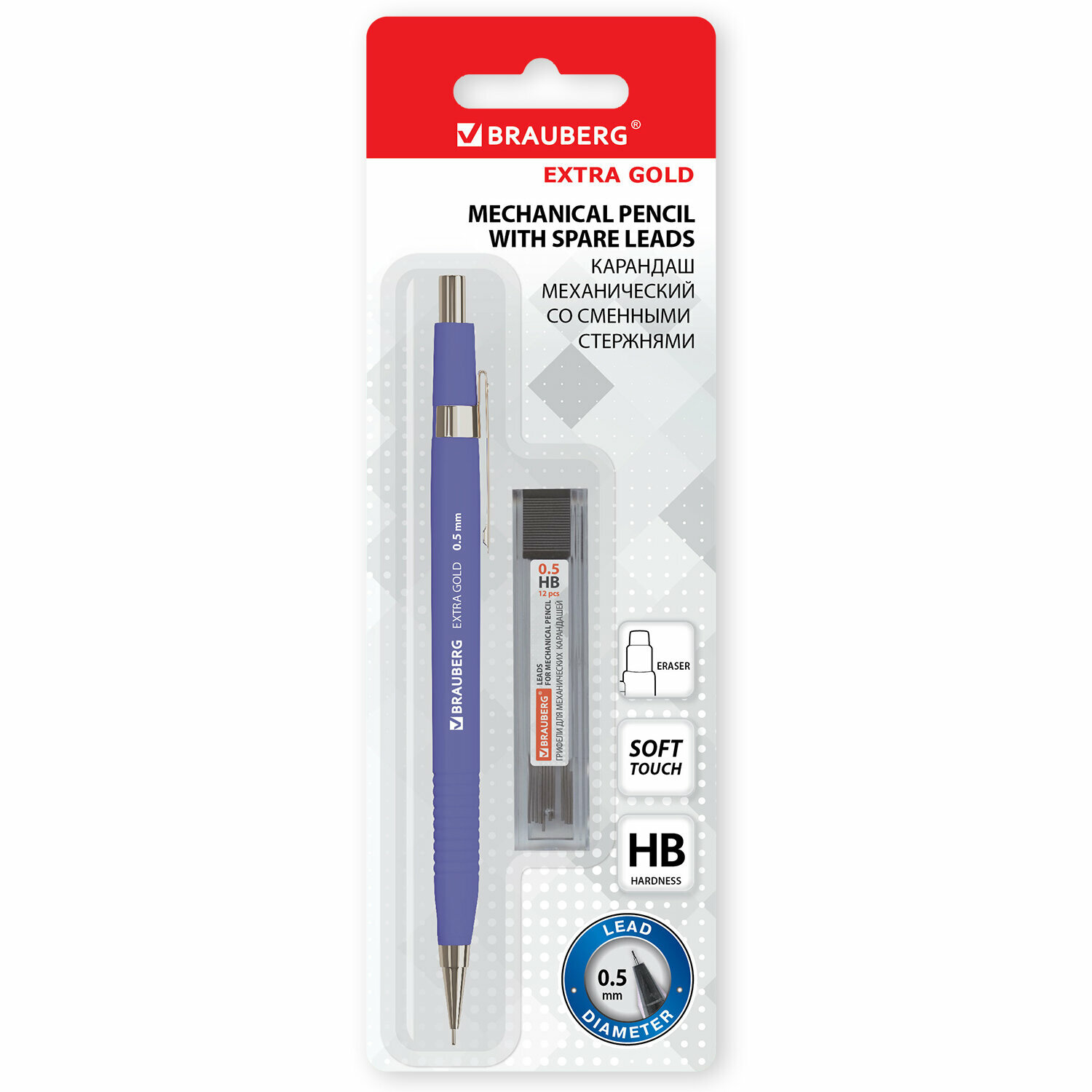 Карандаш механический Brauberg 0,5 мм, грифели HB, 12 штук на блистере, Extra Gold, корпус Soft Touch, ластик интересное: