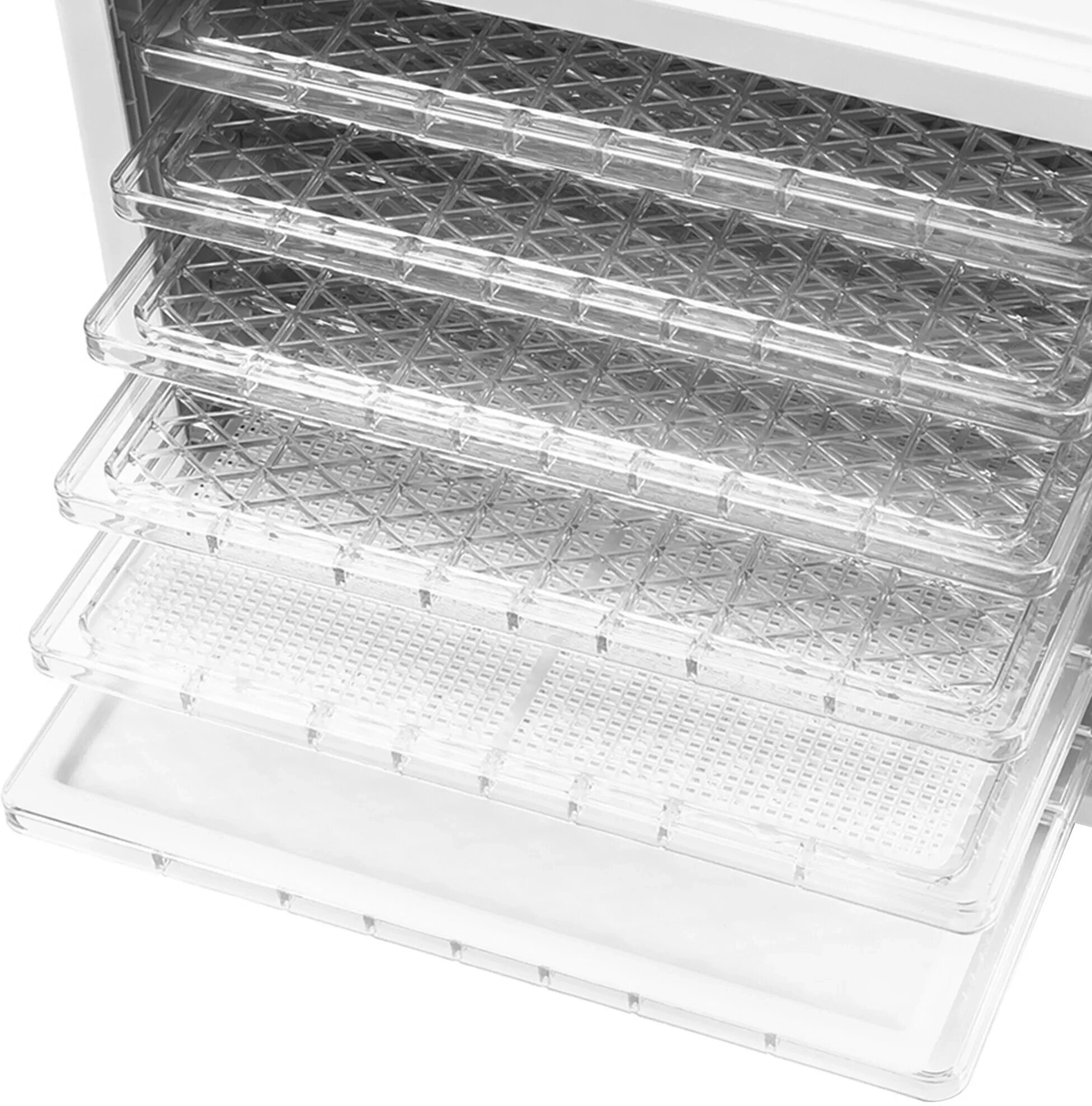 6 поддонов для сушки, 6 для пастилы и 6 сеточек для мелких продуктов. Белый цвет очень вписался в белую кухню, Очень легкая. |