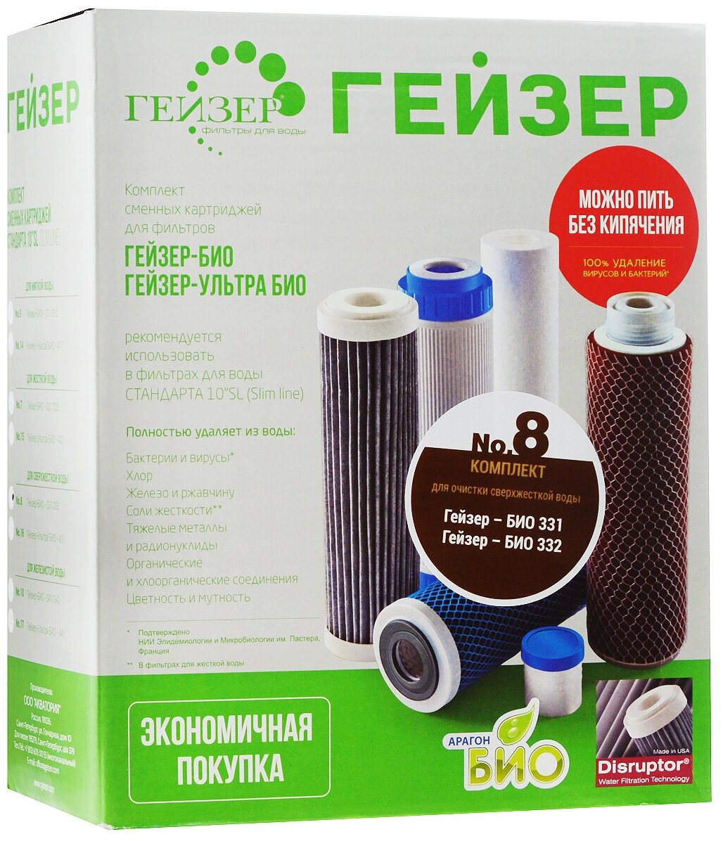 Комплект картриджей Гейзер № 8, 100% удаление бактерий и вирусов, предназначен для фильтров Гейзер БИО 331 и Гейзер БИО 332 (воды с высоким содержанием солей), 50036
