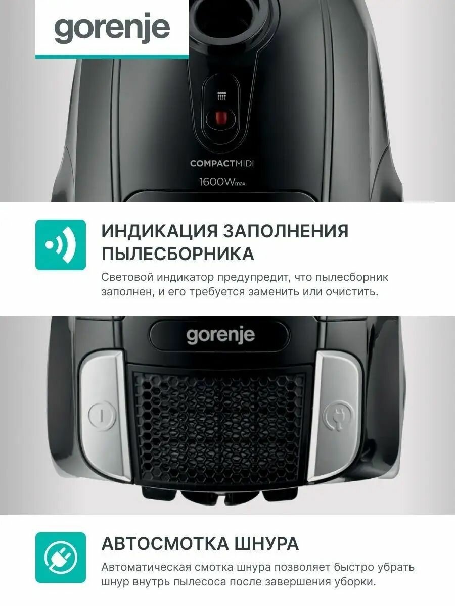 Пылесос для дома Gorenje VC1611CMBK мощность 1600 Вт, индикатор заполнения пылесборника, 2 положения парковки, черный
