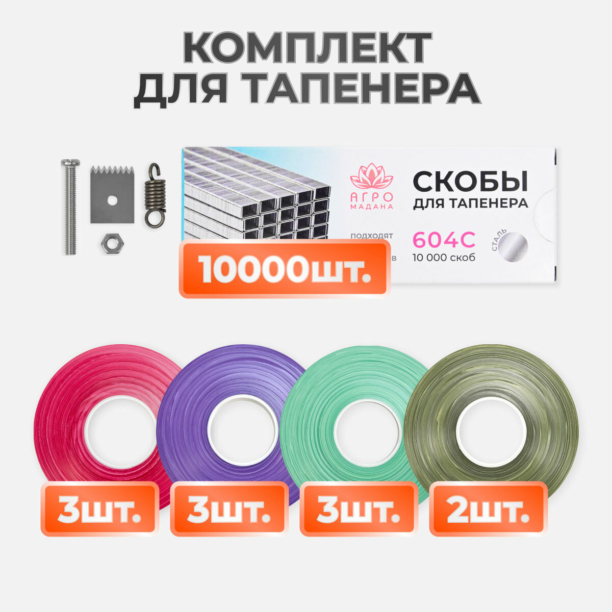 Купить Лента для садового степлера Набор M: лента красная 3 шт, зеленая 3 шт, фиолетовая 3 шт, оливковая 2 шт + скобы 10.000 шт + ремкомплект