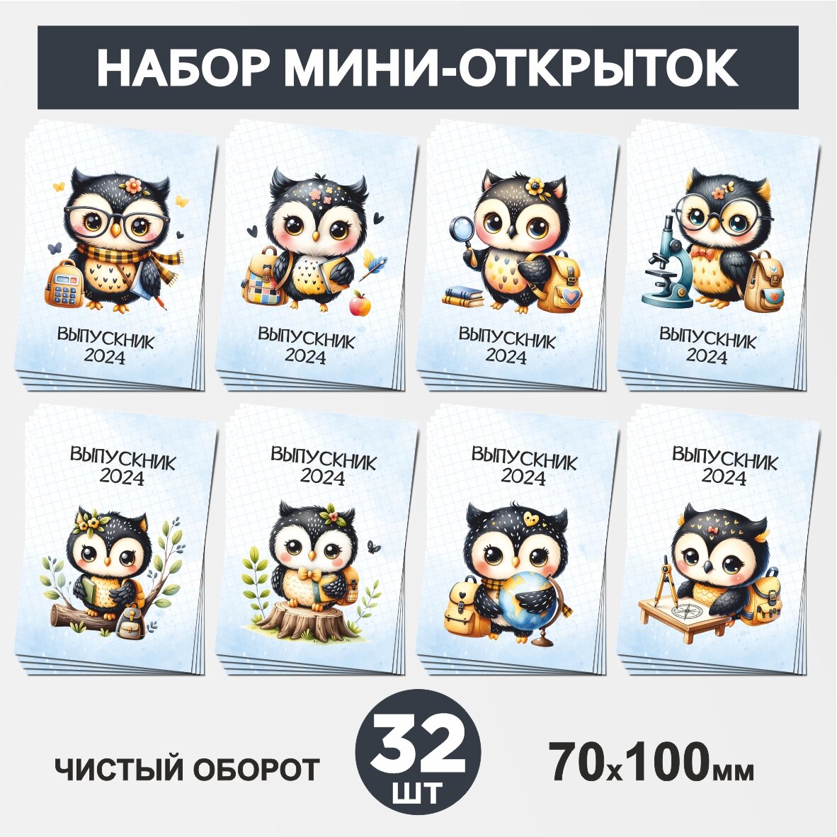 Набор мини-открыток 32 шт, 70х100мм, для подарков выпускнику, 1 сентября, День Рождения, Школьная сова #000 - №2, postcard_32_school_owls_#000_set_2 интересное: