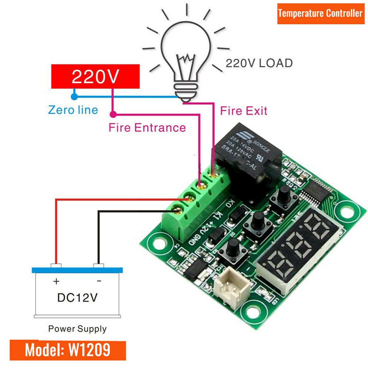 Купить W1209, Термореле с герметичным датчиком 12В, 10А, от -50 ~ +110°C