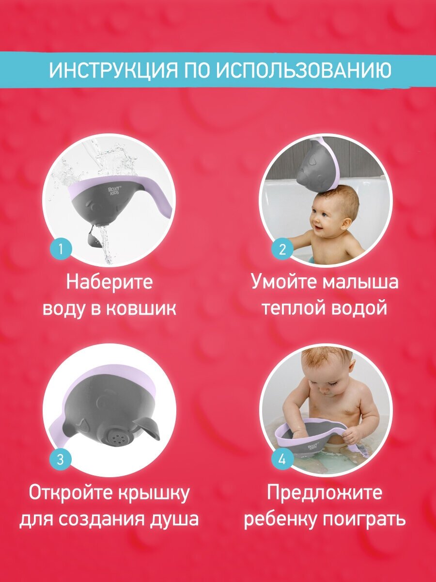 | Отзыв: | Классный ковш для ванны, очень удобно мыть голову ребёнку, особенно если малыш не любит мыть голову и плачет. С ковшом можно отлично играть, развлекать ребёнка в ванной, показывать как течёт вода из лейки, дать погрызть ковшик и в процессе игры спокойно и без истерик помыть голову. Ковш похож на кита, у него есть хвостик и глазки, он у нас как отдельный персонаж для игры. И в ванной смотрится очень симпатично. Края у лейки мягкие, ими нельзя пораниться |