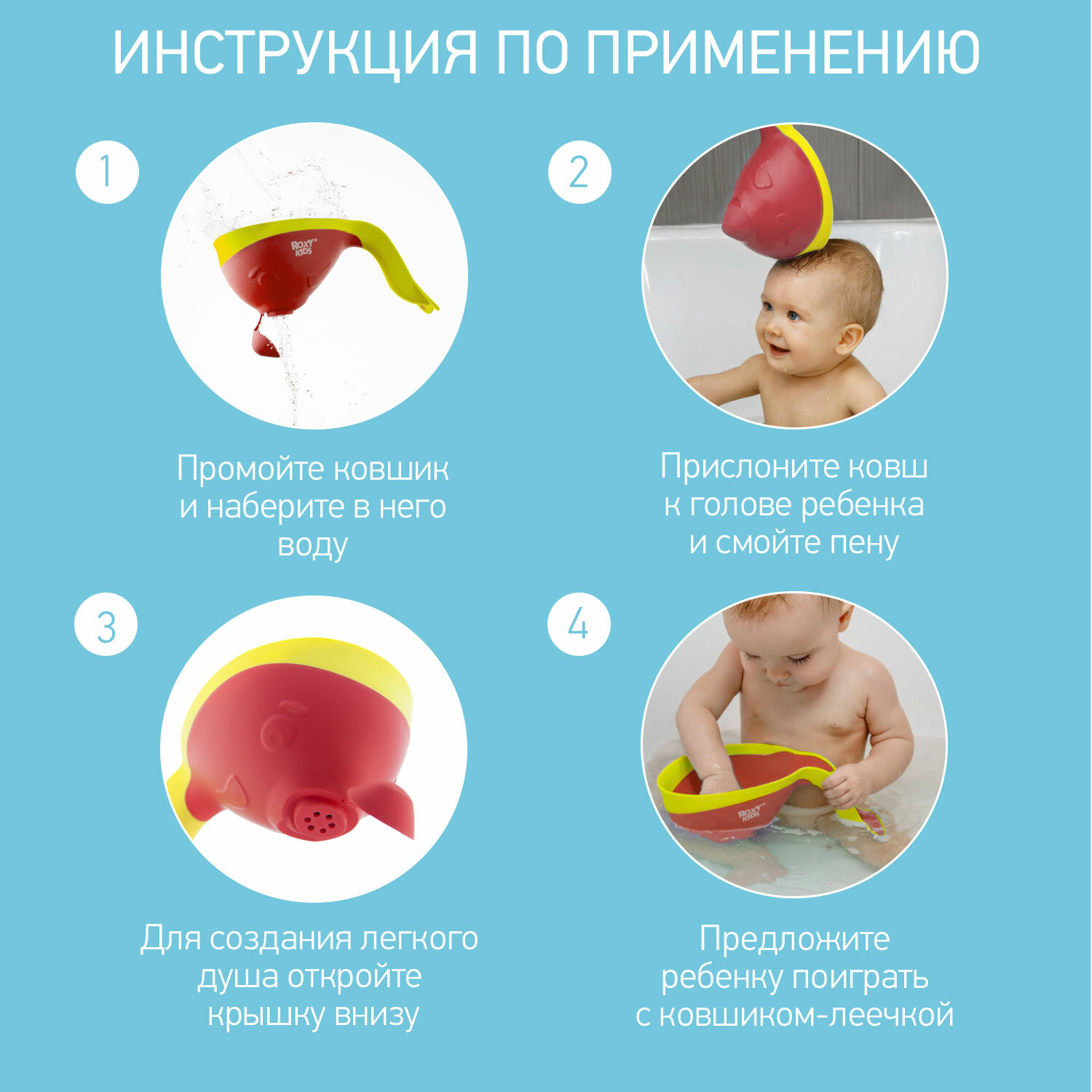 | Отзыв: | Классный ковш для ванны, очень удобно мыть голову ребёнку, особенно если малыш не любит мыть голову и плачет. С ковшом можно отлично играть, развлекать ребёнка в ванной, показывать как течёт вода из лейки, дать погрызть ковшик и в процессе игры спокойно и без истерик помыть голову. Ковш похож на кита, у него есть хвостик и глазки, он у нас как отдельный персонаж для игры. И в ванной смотрится очень симпатично. Края у лейки мягкие, ими нельзя пораниться |
