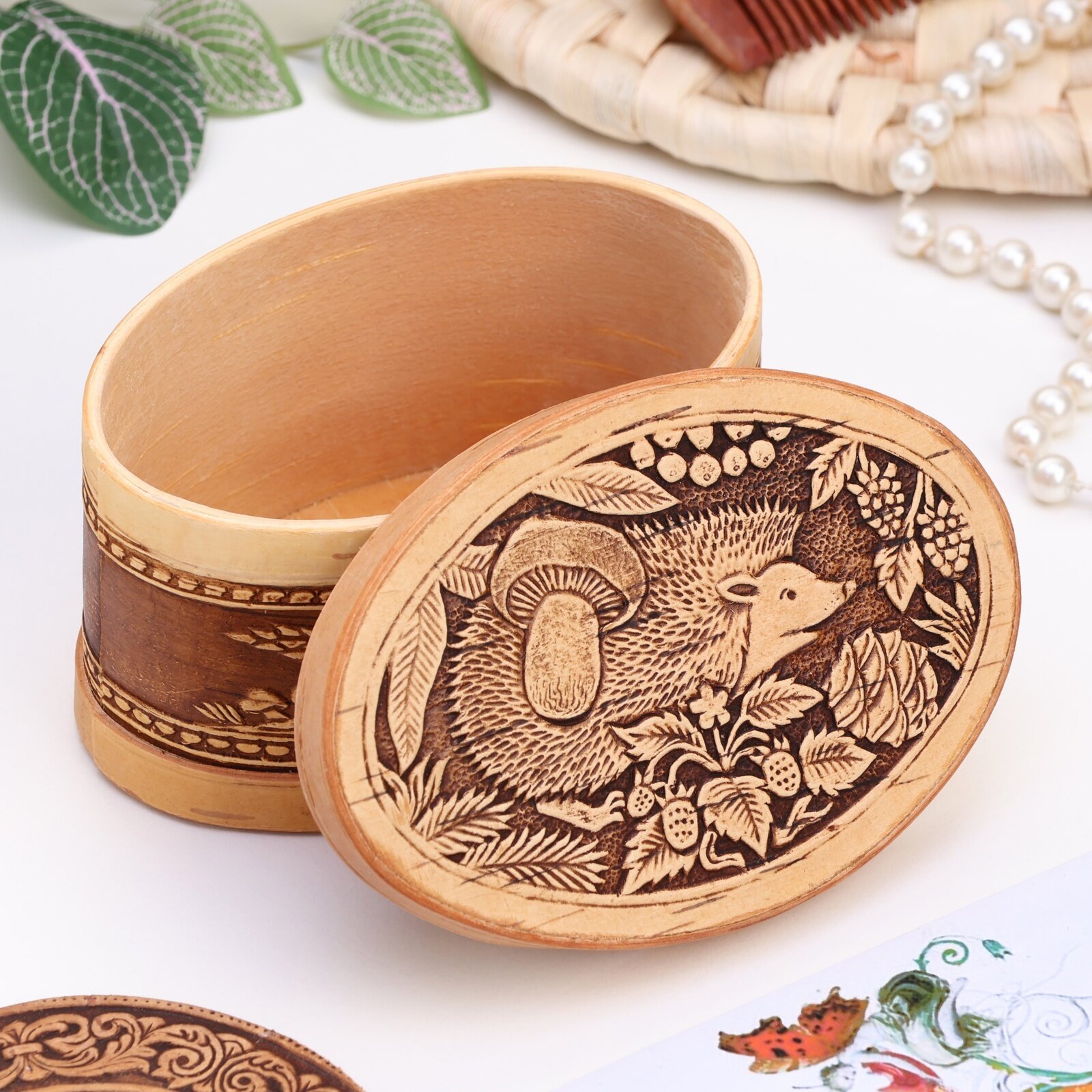 Шкатулка «Ёжик - чудак», овал, 12×8,5×6,5 см, береста интересное: