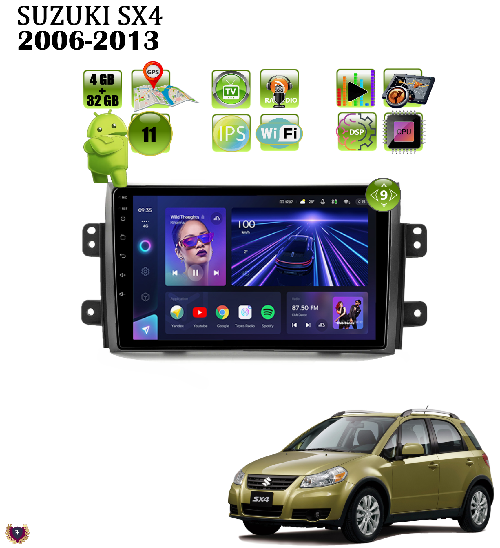 Автомагнитола для Suzuki SX4 (2006-2013), Android 11, 2/32 Gb, Wi-Fi, Bluetooth, GPS, IPS, FM, TV, Hands Free, разделение экрана, поддержка кнопок на руле