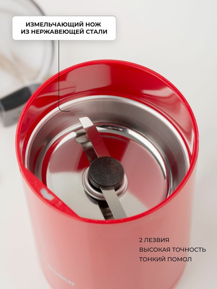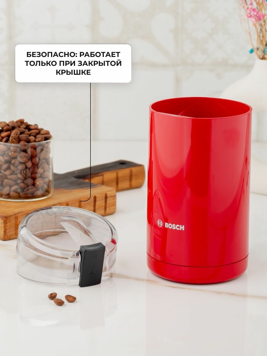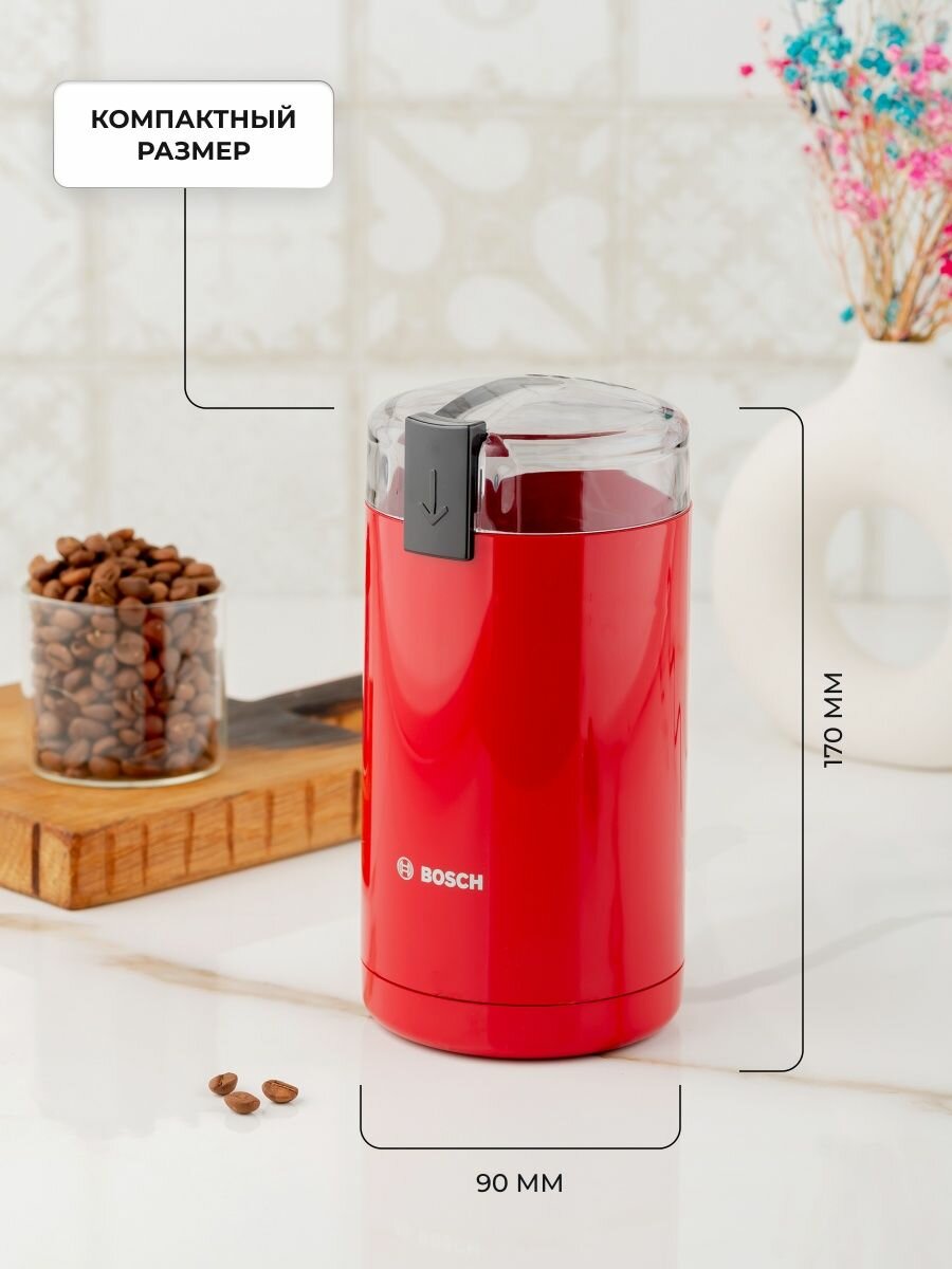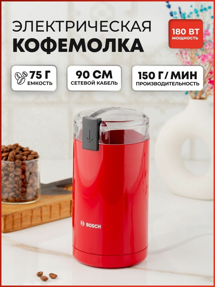 Кофемолка электрическая Bosch TSM 6A014R, до 75 г зерен, 180 Вт, один режим помола, 150 грамм в минуту, нож из нержавеющей стали, красная