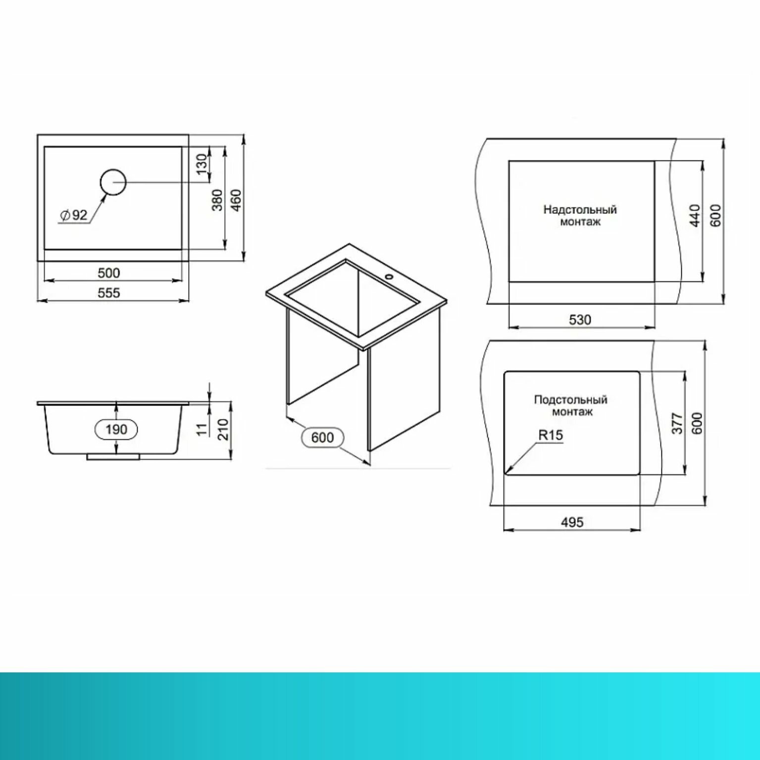 Кухонная мойка кварцевая Granula GR-5551 квадратная подстольная односекционная, подстольная, чаша 500х380, цвет алюминиум (5551al)