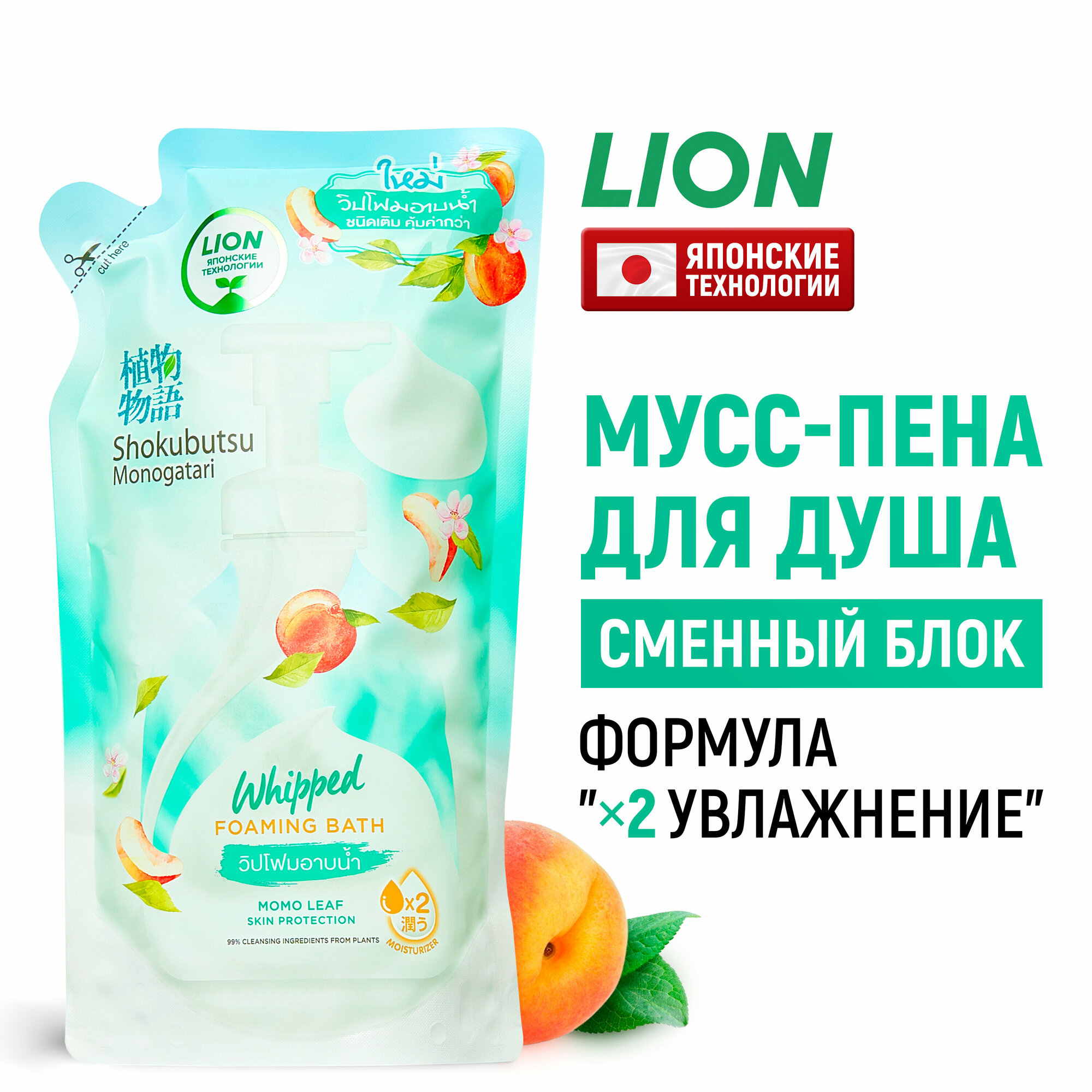 LION Shokubutsu Гель-пена для душа увлажняющая с натуральным экстрактом листьев Момо (персика) c дозатором, 450 мл