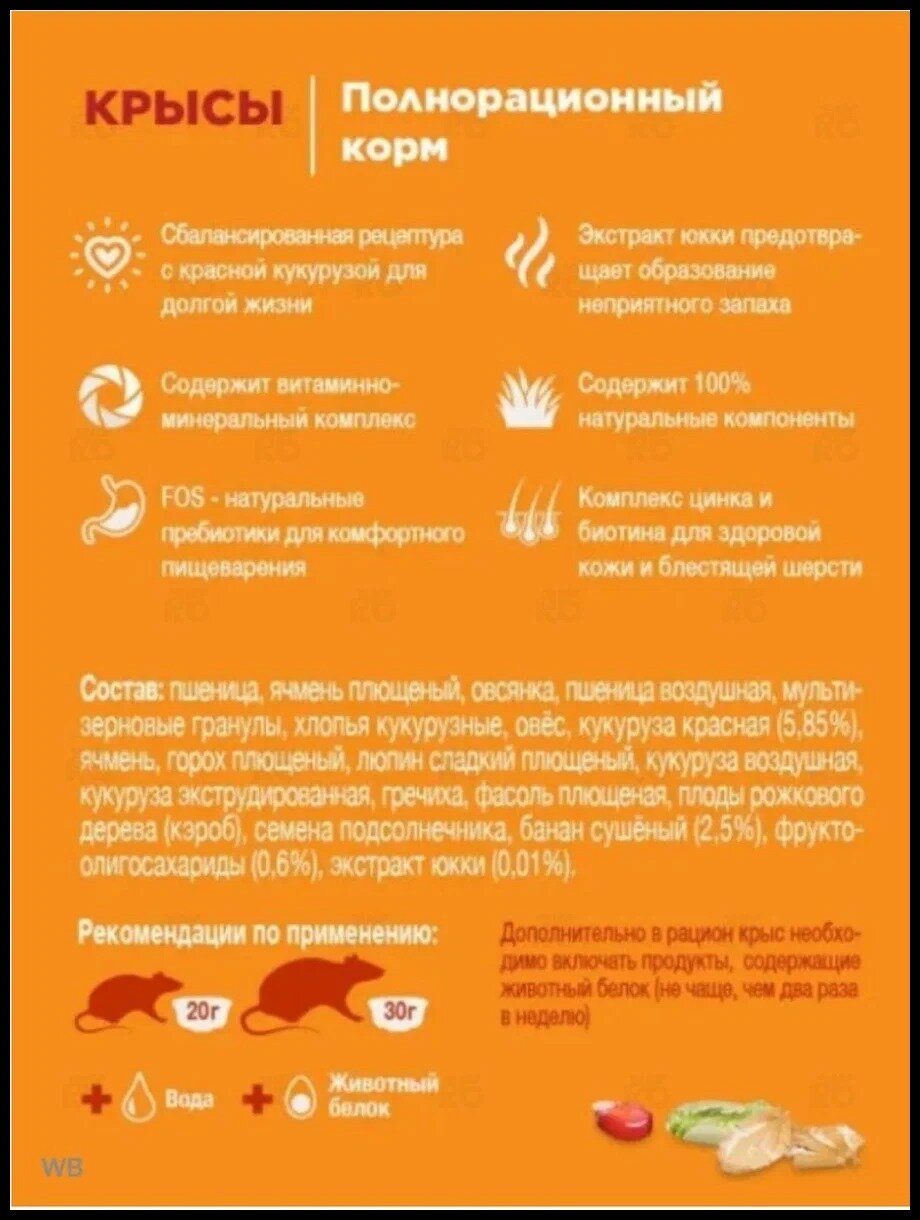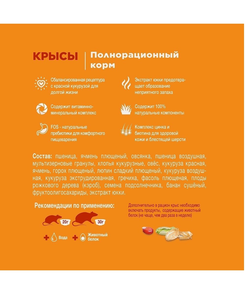 Крысы очень любят полезный много вкусняшик Недостатки: Быстро кончается Очень хороший и качественный корм |