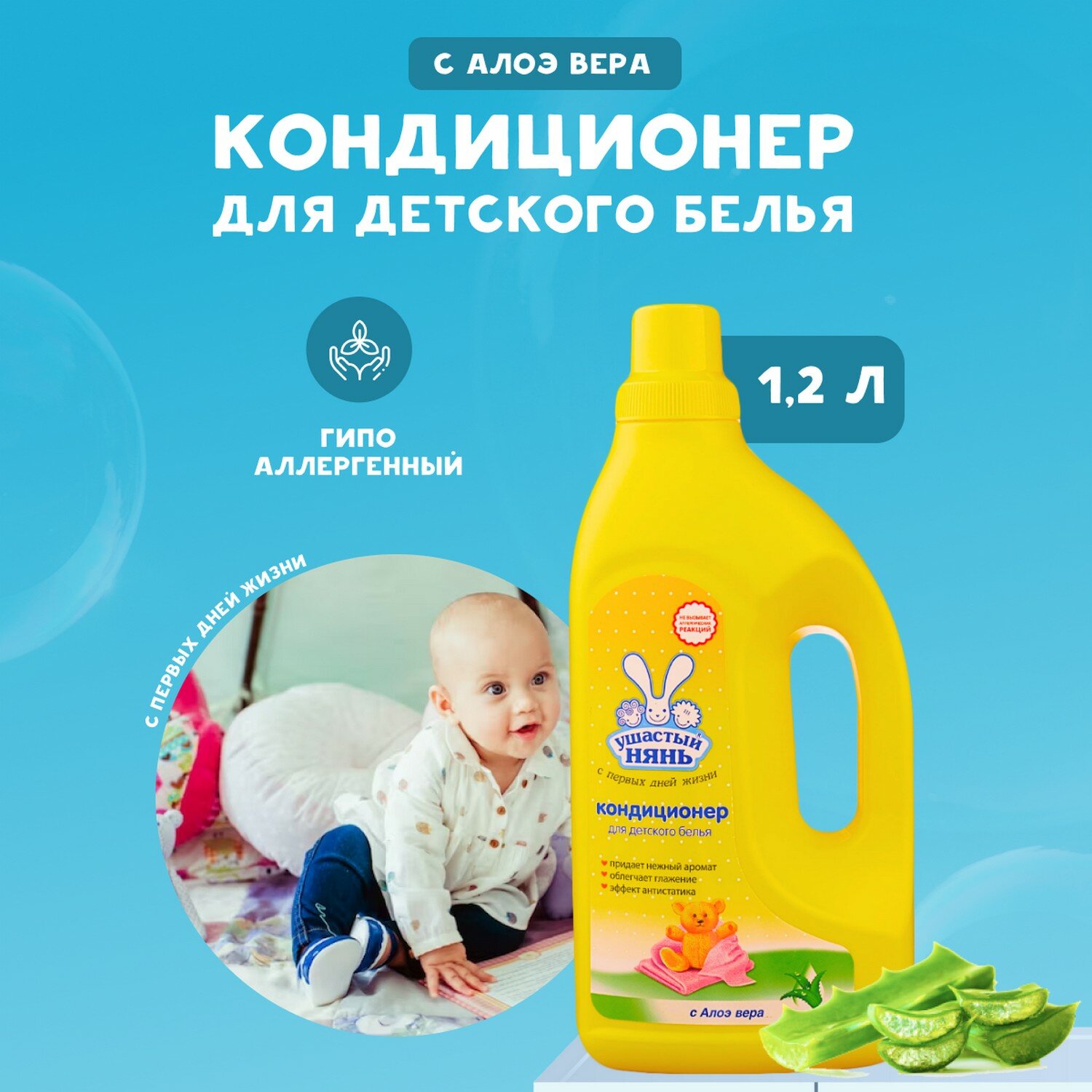 Ушастый Нянь Кондиционер для детского белья с Алоэ вера, 1 л, 1 кг
