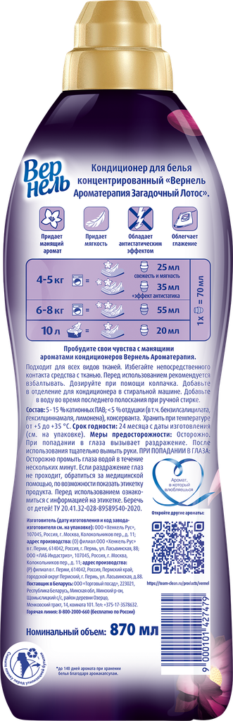 Вернель Кондиционер для белья, Загадочный лотос, 870 мл, 2 шт