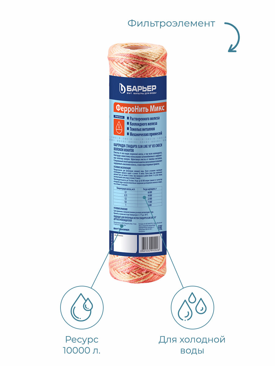 СохранитьСменный картридж для магистрального фильтра БАРЬЕР ФерроНить Микс 10 мкм Slim Line 10 (SL10), защищает от металлов интересное:
