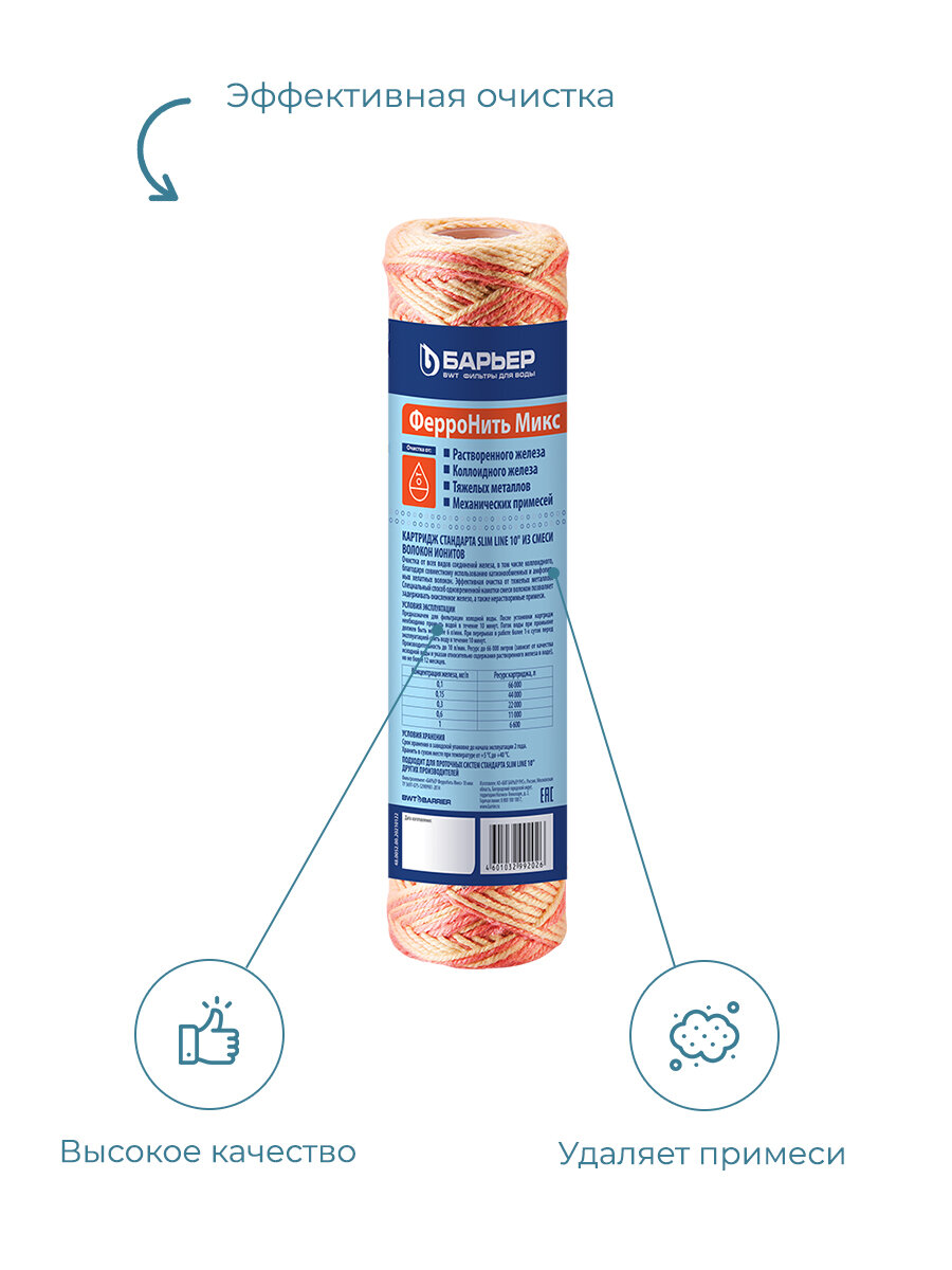 Сменный картридж для магистрального фильтра БАРЬЕР ФерроНить Микс 10 мкм Slim Line 10 (SL10), защищает от металлов