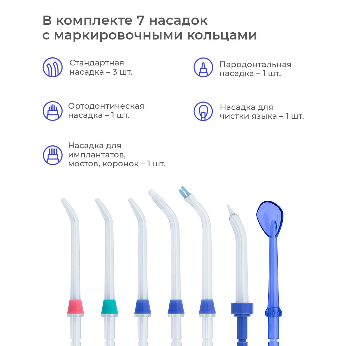 - семь насадок в комплекте, в том числе и для чистки брекет-систем - ножки-присоски, благодаря им ирригатор надежно устанавливается на поверхности раковины |