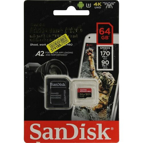 Купить Карта памяти SanDisk microSDXC 64 ГБ Class 10, V30, A2, UHS Class 3, R/W 170/90 МБ/с, адаптер на SD