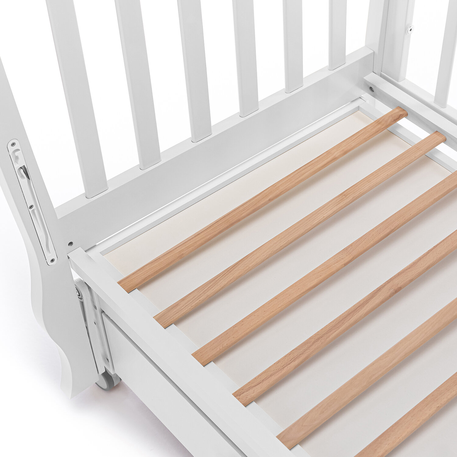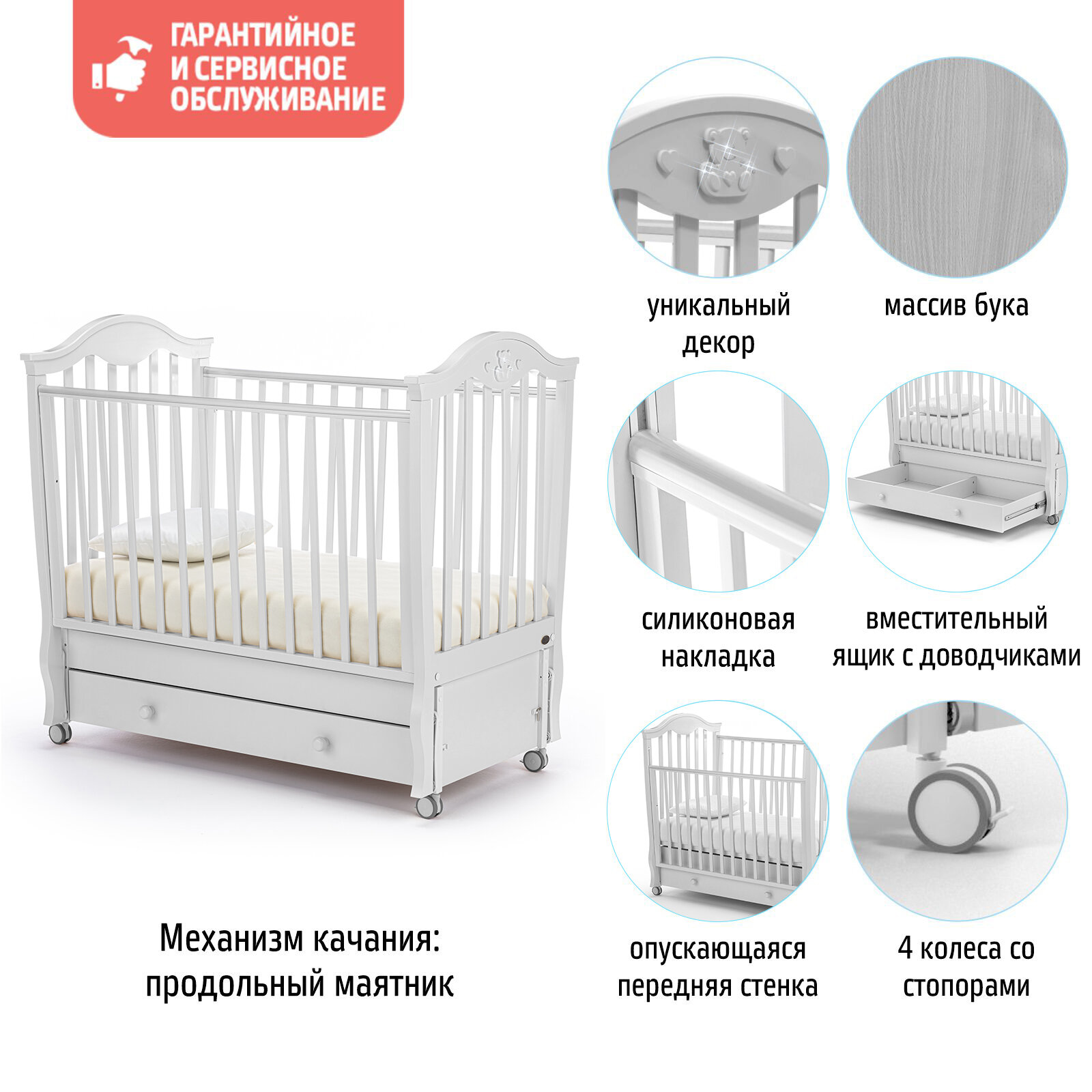 | Плюсы: | Очень красиво смотрится. Есть продольный маятниковый механизм, мягко и тихо движется. Высоту дна менять можно и стенку опустить для удобства (у меня рост небольшой, я стенку опустила и ребенка класть и доставать мне комфортно), все это не сложно выставляется. Материалы отличные использованы. |